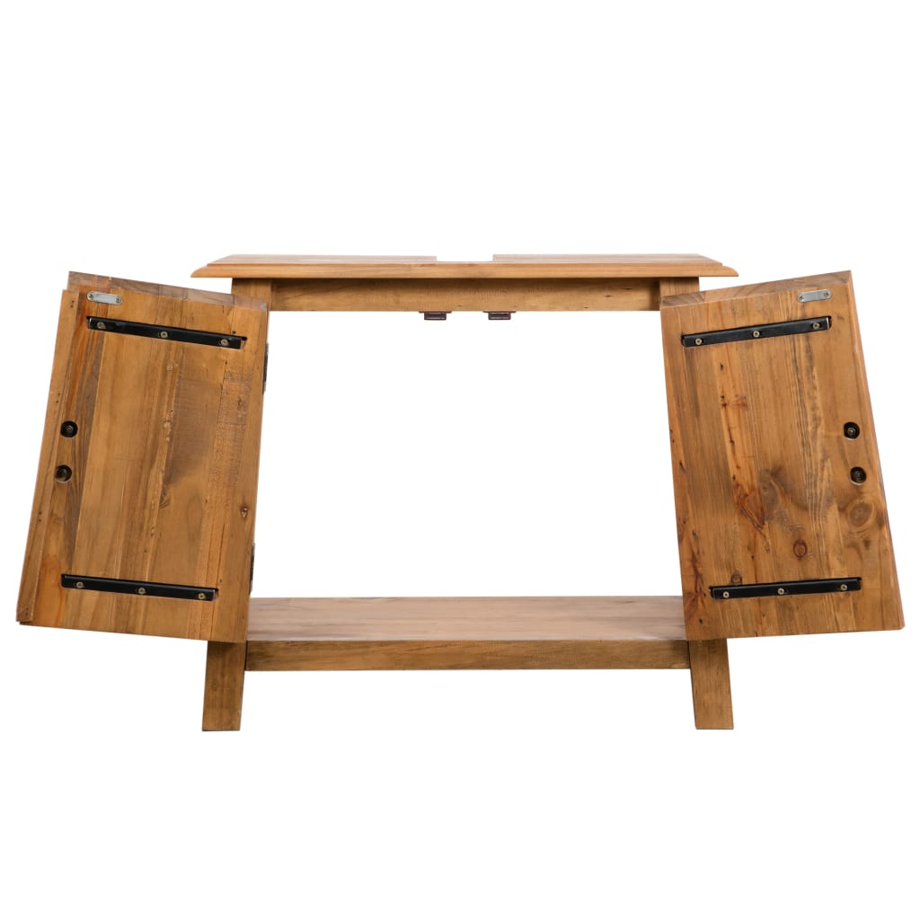 Dieser Waschtischunterschrank im Retro-Design verleiht Ihrem Badezimmer einen rustikalen Charme! Dieser Schrank wurde mit dem Ziel entwickelt, die Sanitäranlagen Ihres Waschbeckens zu verdecken. Dieser robuste, stabile und langlebige Unterschrank wurde mit größter Sorgfalt aus recyceltem massivem Kiefernholz gefertigt, seine handwerkliche Finesse trägt zu seinem spektakulären Vintage-Stil bei. Wichtiger Hinweis: Farbe und Holzmaserung können von Artikel zu Artikel variieren, wodurch jedes Möbelstück einzigartig wird. Die Lieferung erfolgt in zufälliger Reihenfolge.