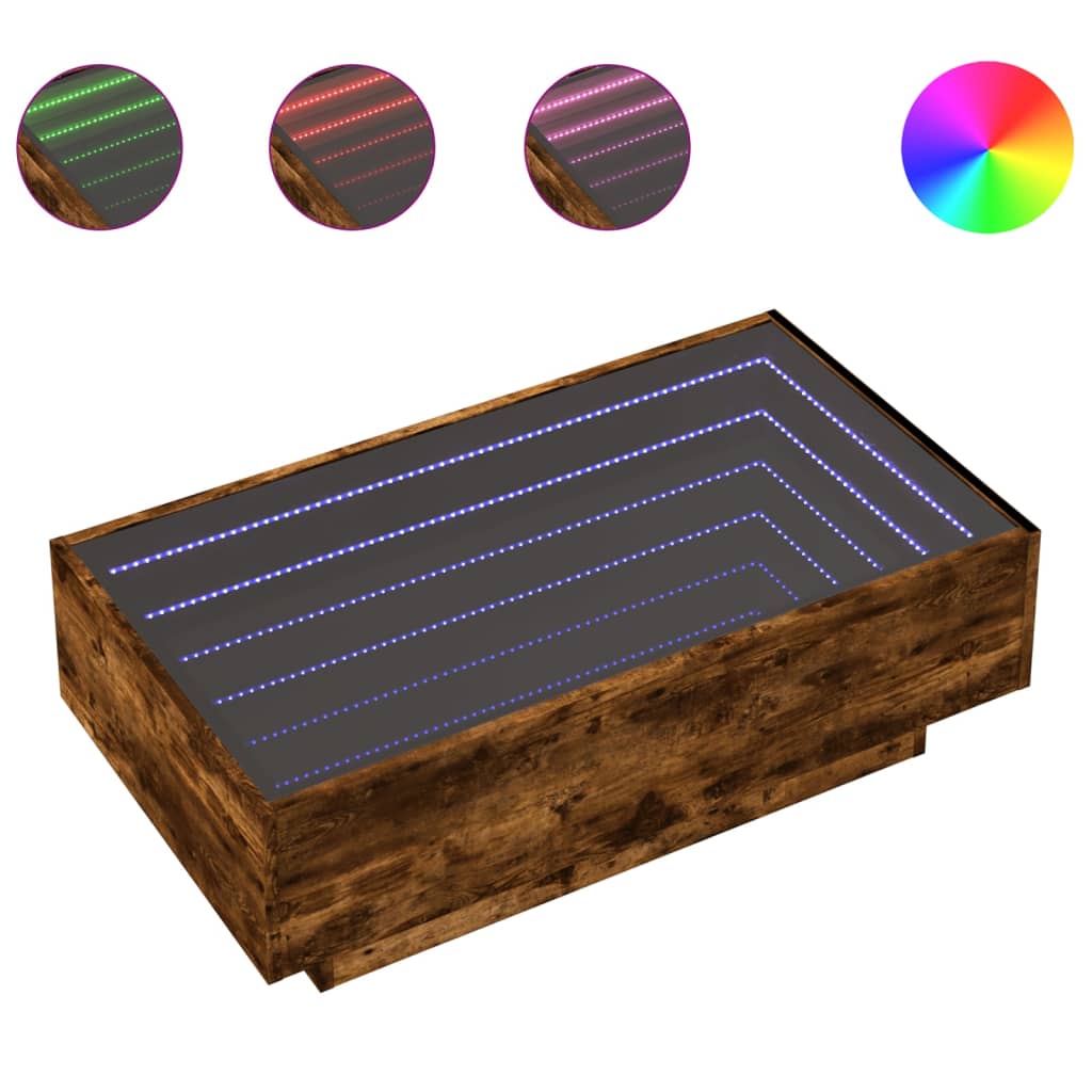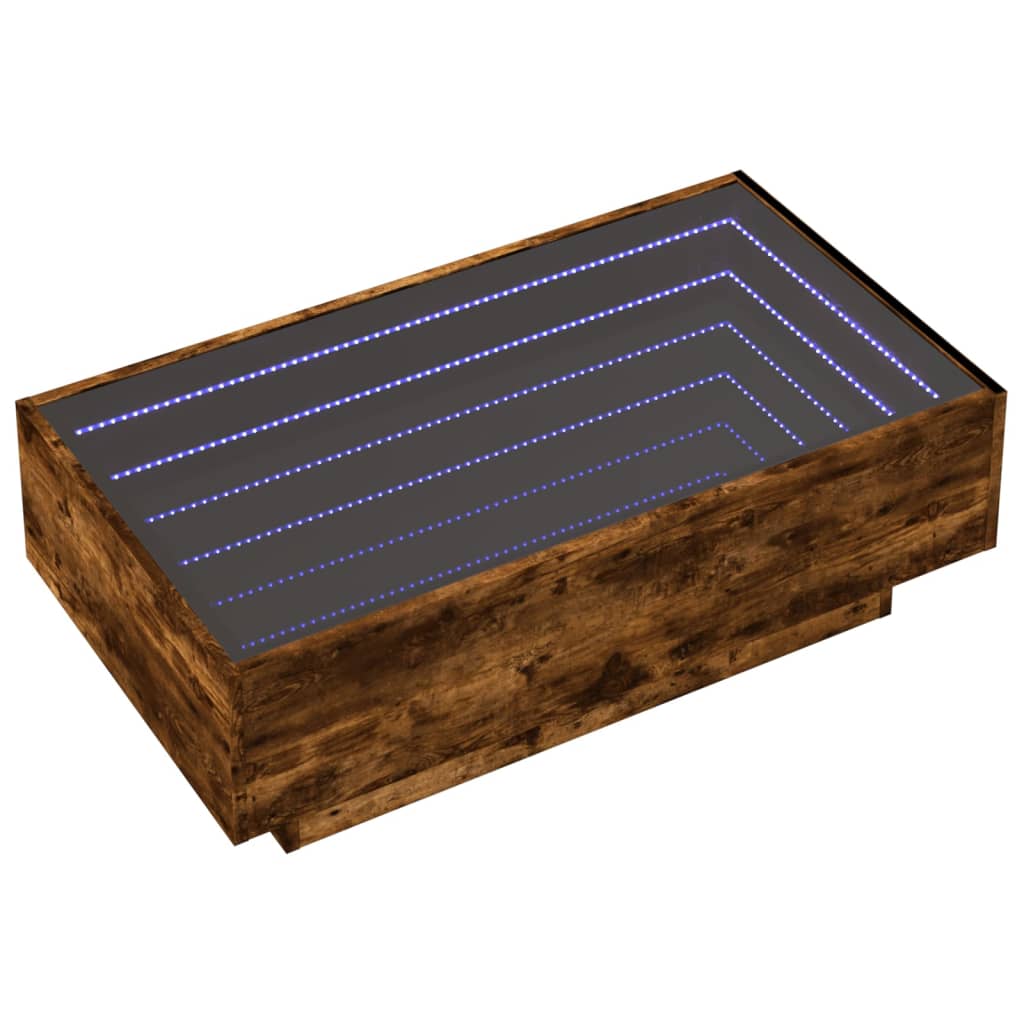 Dieser einzigartige Couchtisch ist mit einem LED-Infinity-Spiegel versehen und eignet sich für die unterschiedlichsten Umgebungen. Er darf aus deinem Zuhause nicht fehlen. Starkes und langlebiges Material: Holzwerkstoff ist ein langlebiges und robustes Material mit einer glatten Oberfläche, das gegen Feuchtigkeit, Verformung und Rissbildung beständig ist, wodurch es eine zuverlässigen Wahl für die Herstellung von Möbeln ist.RGB-LED-Beleuchtung für ein angenehmes Ambiente: Dieser Couchtisch ist mit LED-Leuchten ausgestattet, die sich leicht einstellen lassen, um eine personalisierte Lichtshow zu erstellen, die das Ambiente deines Raums aufwertet.Robuste Tischplatte: Die robuste Tischplatte bietet den perfekten Platz für Getränke, Snacks und einige Dekoartikel.Vielseitig einsetzbar: Dieser Couchtisch lässt sich vielseitig einsetzen. Er kann je nach Bedarf als Beistelltisch, Ablagetisch oder Kaffeetisch in deinem Wohn- oder Schlafzimmer dienen. Gut zu wissen:Das Produkt verfügt über einen USB-Anschluss, für den eine zertifizierte 5V-USB-Stromquelle erforderlich ist (nicht im Lieferumfang enthalten).