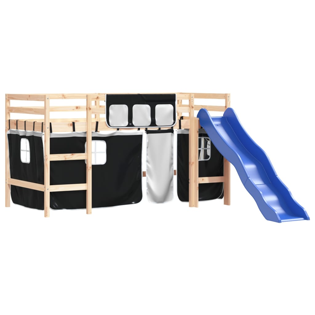 Kinderhochbett mit Vorhängen Weiß und Schwarz Massivholz Kiefer