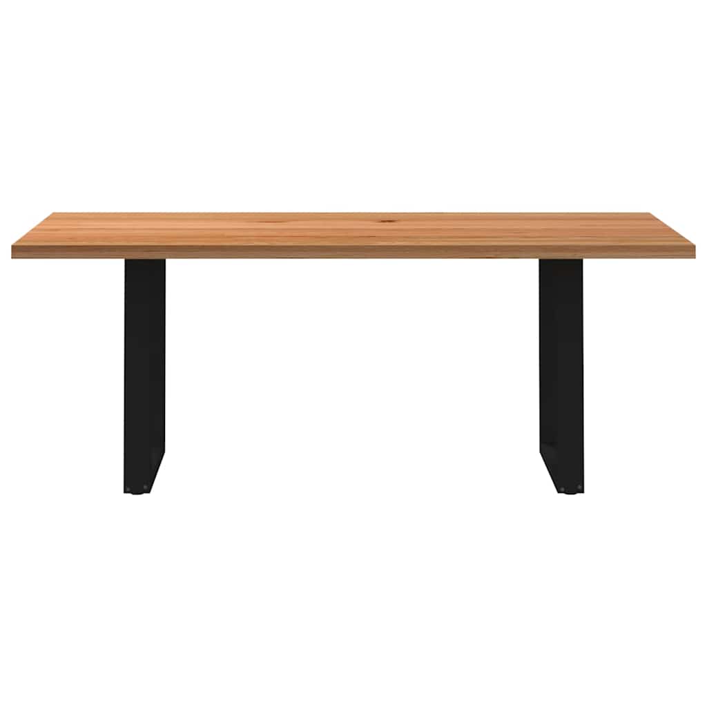 Mach jede Mahlzeit unvergesslich, indem du dich jeden Tag mit deiner Familie oder deinen Freunden um diesen Esstisch aus Holz versammelst! Robustes und langlebiges Material: Massives Eichenholz ist für seine Festigkeit, Haltbarkeit und schöne Maserung bekannt, weshalb es sich hervorragend für haltbare Möbel eignet. Durch seine natürliche Beständigkeit gegen Insektenbefall und Schimmelbildung sehen Eichenmöbel selbst nach jahrelangem Gebrauch brandneu aus.Großer Tisch: Dieser Tisch bietet mit seinen Maßen von 200 x 90 cm viel Platz zum Sitzen und ist das Herzstück deines Essbereichs.Einzigartiger Charme: Da Äste, Risse und Farbabweichungen natürliche Merkmale des Eichenholzes sind, hat jedes Stück dieses Produkts seinen ganz eigenen Charme. Auf den Bildern siehst du Beispiele für die zu erwartenden Variationen.Praktisches Design: Diese Esstischbeine sind mit verstellbaren Nivellierfüßen ausgestattet, die auch auf unebenen Böden für Stabilität sorgen und Bodenkratzer minimieren. Außerdem verfügt die Halterung über vorgebohrte Löcher und mitgelieferte Schrauben, mit denen das Bein an der Tischplatte befestigt werden kann, was die Montage erleichtert.Robustes und stabiles Gestell: Dieser Esszimmertisch hat U-förmige Beine aus pulverbeschichtetem Stahl, die für außergewöhnliche Stabilität und Sicherheit sorgen. Gut zu wissen:Jedes Stück ist ein Unikat, das in Farbe und Maserung variiert. Die Lieferung erfolgt in zufälliger Reihenfolge, wodurch die Exklusivität und Individualität deines Produkts gewährleistet wird.Äste und kleinere Fehler werden mit schwarzem Füllmaterial aufgefüllt, um eine schöne und glatte Tischoberfläche zu erhalten. Beispiele findest du in den Abbildungen.Die Tischplatte ist an den Rändern 4 cm dick, um ein robustes Aussehen zu gewährleisten, und in der Mitte 2 cm dick, um den Holzverbrauch und das Gesamtgewicht zu reduzieren.Bitte bohre die Löcher in der Mitte, nicht an den Rändern der Platte.Bitte achte darauf, die maximale Bohrtiefe von 15 mm nicht zu überschreiten, um die Tischplatte nicht zu beschädigen, da die Plattenstärke 20 mm beträgt.Wir empfehlen, einen Schraubendreher anstelle einer elektrischen Bohrmaschine zu verwenden, um Holzrisse beim Anbringen der Beine zu vermeiden.