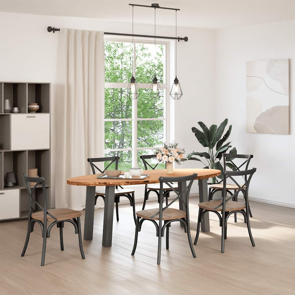 Mach jede Mahlzeit unvergesslich, indem du dich jeden Tag mit deiner Familie oder deinen Freunden um diesen Esstisch aus Holz versammelst! Robustes und langlebiges Material: Massives Eichenholz ist für seine Festigkeit, Haltbarkeit und schöne Maserung bekannt, weshalb es sich hervorragend für haltbare Möbel eignet. Durch seine natürliche Beständigkeit gegen Insektenbefall und Schimmelbildung sehen Eichenmöbel selbst nach jahrelangem Gebrauch brandneu aus.Großer Tisch: Dieser Tisch bietet mit seinen Maßen von 220 x 100 cm viel Platz zum Sitzen und ist das Herzstück deines Essbereichs.Einzigartiger Charme: Da Äste, Risse und Farbabweichungen natürliche Merkmale des Eichenholzes sind, hat jedes Stück dieses Produkts seinen ganz eigenen Charme. Auf den Bildern siehst du Beispiele für die zu erwartenden Variationen.Praktisches Design: Diese Esstischbeine sind mit verstellbaren Nivellierfüßen ausgestattet, die auch auf unebenen Böden für Stabilität sorgen und Bodenkratzer minimieren. Außerdem verfügt die Halterung über vorgebohrte Löcher und mitgelieferte Schrauben, mit denen das Bein an der Tischplatte befestigt werden kann, was die Montage erleichtert.Robustes und stabiles Gestell: Die Beine dieses Esszimmertischs sind aus pulverbeschichtetem Stahl gefertigt, der für außergewöhnliche Stabilität und Sicherheit sorgt. Gut zu wissen:Jedes Stück ist ein Unikat, das in Farbe und Maserung variiert. Die Lieferung erfolgt in zufälliger Reihenfolge, wodurch die Exklusivität und Individualität deines Produkts gewährleistet wird.Äste und kleinere Fehler werden mit schwarzem Füllmaterial aufgefüllt, um eine schöne und glatte Tischoberfläche zu erhalten. Beispiele findest du in den Abbildungen.Die Tischplatte ist an den Rändern 4 cm dick, um ein robustes Aussehen zu gewährleisten, und in der Mitte 2 cm dick, um den Holzverbrauch und das Gesamtgewicht zu reduzieren.Bitte bohre die Löcher in der Mitte, nicht an den Rändern der Platte.Bitte achte darauf, die maximale Bohrtiefe von 15 mm nicht zu überschreiten, um die Tischplatte nicht zu beschädigen, da die Plattenstärke 20 mm beträgt.Wir empfehlen, einen Schraubendreher anstelle einer elektrischen Bohrmaschine zu verwenden, um Holzrisse beim Anbringen der Beine zu vermeiden.