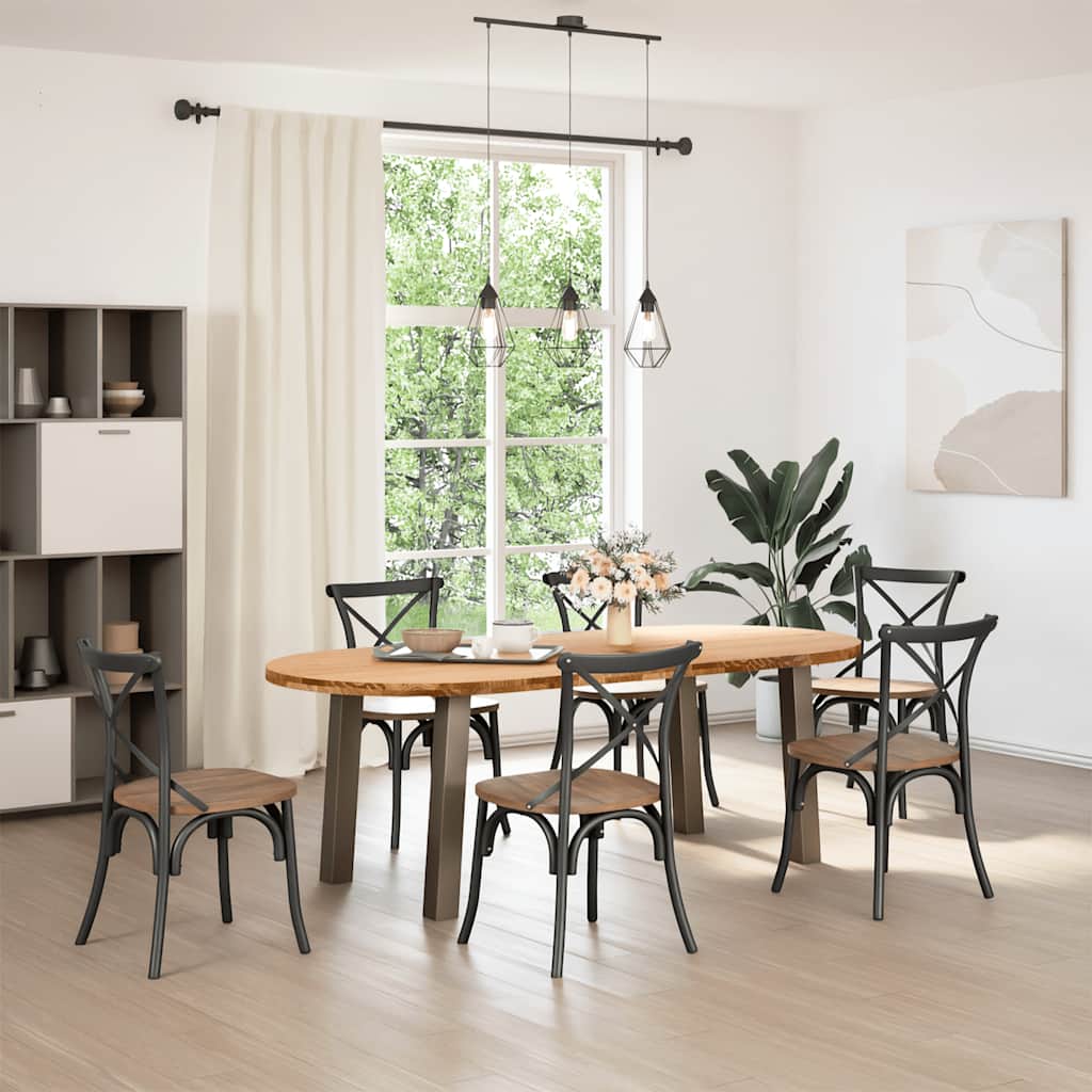 Mach jede Mahlzeit unvergesslich, indem du dich jeden Tag mit deiner Familie oder deinen Freunden um diesen Esstisch aus Holz versammelst! Robustes und langlebiges Material: Massives Eichenholz ist für seine Festigkeit, Haltbarkeit und schöne Maserung bekannt, weshalb es sich hervorragend für haltbare Möbel eignet. Durch seine natürliche Beständigkeit gegen Insektenbefall und Schimmelbildung sehen Eichenmöbel selbst nach jahrelangem Gebrauch brandneu aus.Großer Tisch: Dieser Tisch bietet mit seinen Maßen von 220 x 100 cm viel Platz zum Sitzen und ist das Herzstück deines Essbereichs.Einzigartiger Charme: Da Äste, Risse und Farbabweichungen natürliche Merkmale des Eichenholzes sind, hat jedes Stück dieses Produkts seinen ganz eigenen Charme. Auf den Bildern siehst du Beispiele für die zu erwartenden Variationen.Praktisches Design: Diese Esstischbeine sind mit verstellbaren Nivellierfüßen ausgestattet, die auch auf unebenen Böden für Stabilität sorgen und Bodenkratzer minimieren. Außerdem verfügt die Halterung über vorgebohrte Löcher und mitgelieferte Schrauben, mit denen das Bein an der Tischplatte befestigt werden kann, was die Montage erleichtert.Robustes und stabiles Gestell: Die Beine dieses Esszimmertischs sind aus pulverbeschichtetem Stahl gefertigt, der für außergewöhnliche Stabilität und Sicherheit sorgt. Gut zu wissen:Jedes Stück ist ein Unikat, das in Farbe und Maserung variiert. Die Lieferung erfolgt in zufälliger Reihenfolge, wodurch die Exklusivität und Individualität deines Produkts gewährleistet wird.Äste und kleinere Fehler werden mit schwarzem Füllmaterial aufgefüllt, um eine schöne und glatte Tischoberfläche zu erhalten. Beispiele findest du in den Abbildungen.Die Tischplatte ist an den Rändern 4 cm dick, um ein robustes Aussehen zu gewährleisten, und in der Mitte 2 cm dick, um den Holzverbrauch und das Gesamtgewicht zu reduzieren.Bitte bohre die Löcher in der Mitte, nicht an den Rändern der Platte.Bitte achte darauf, die maximale Bohrtiefe von 15 mm nicht zu überschreiten, um die Tischplatte nicht zu beschädigen, da die Plattenstärke 20 mm beträgt.Wir empfehlen, einen Schraubendreher anstelle einer elektrischen Bohrmaschine zu verwenden, um Holzrisse beim Anbringen der Beine zu vermeiden.
