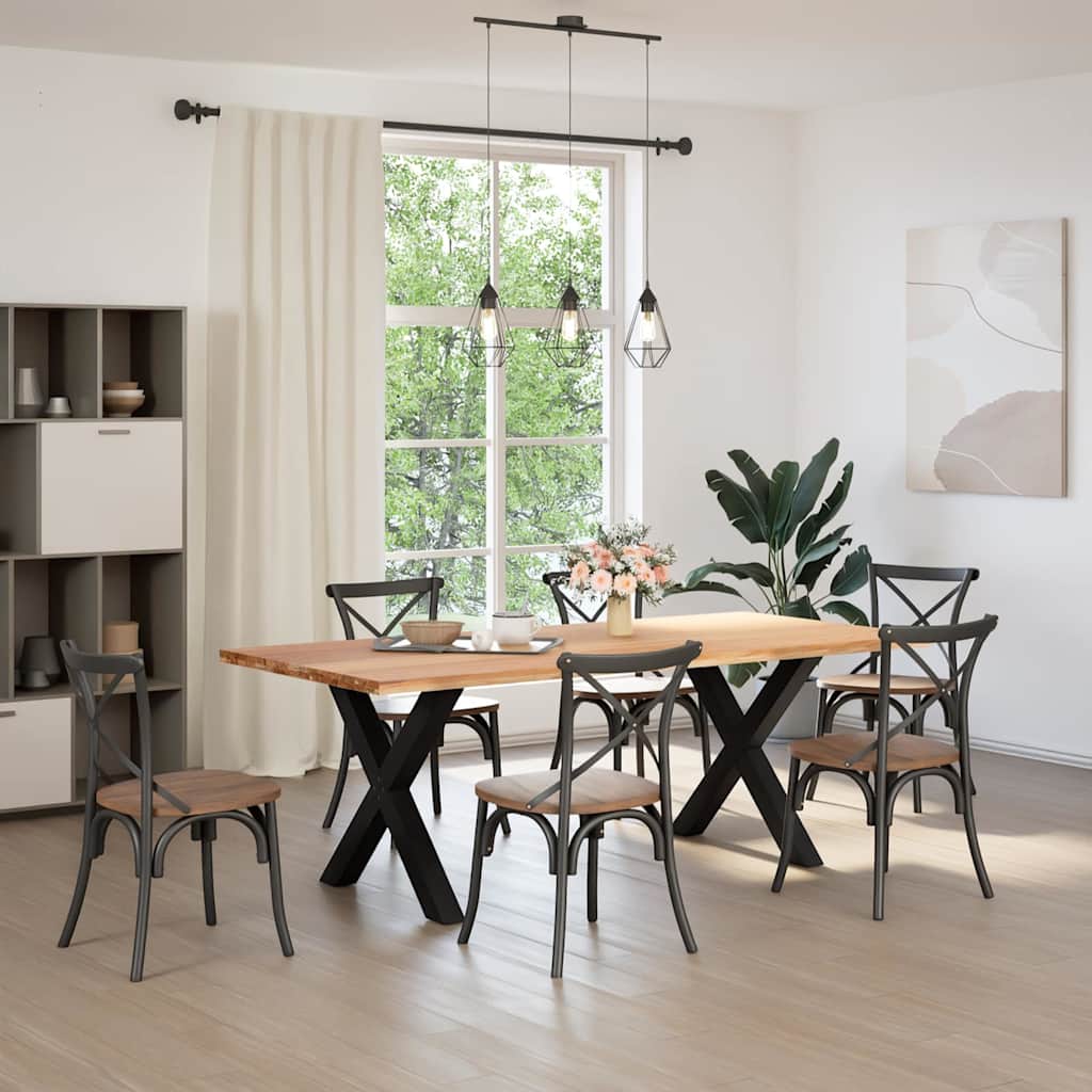 Mach jede Mahlzeit unvergesslich, indem du dich jeden Tag mit deiner Familie oder deinen Freunden um diesen Esstisch aus Holz versammelst! Robustes und langlebiges Material: Massives Eichenholz ist für seine Festigkeit, Haltbarkeit und schöne Maserung bekannt, weshalb es sich hervorragend für haltbare Möbel eignet. Durch seine natürliche Beständigkeit gegen Insektenbefall und Schimmelbildung sehen Eichenmöbel selbst nach jahrelangem Gebrauch brandneu aus.Großer Tisch: Dieser Küchentisch bietet mit seinen Maßen von 220 x 100 cm viel Platz zum Sitzen und ist das Herzstück deines Essbereichs.Einzigartiger Charme: Da Äste, Risse und Farbabweichungen natürliche Merkmale des Eichenholzes sind, hat jedes Stück dieses Produkts seinen ganz eigenen Charme. Auf den Bildern siehst du Beispiele für die zu erwartenden Variationen.Praktisches Design: Diese Esstischbeine sind mit verstellbaren Nivellierfüßen ausgestattet, die auch auf unebenen Böden für Stabilität sorgen und Bodenkratzer minimieren. Außerdem verfügt die Halterung über vorgebohrte Löcher und mitgelieferte Schrauben, mit denen das Bein an der Tischplatte befestigt werden kann, was die Montage erleichtert. Gut zu wissen:Jedes Stück ist ein Unikat, das in Farbe und Maserung variiert. Die Lieferung erfolgt in zufälliger Reihenfolge, wodurch die Exklusivität und Individualität deines Produkts gewährleistet wird.Äste und kleinere Fehler werden mit schwarzem Füllmaterial aufgefüllt, um eine schöne und glatte Tischoberfläche zu erhalten. Beispiele findest du in den Abbildungen.Die Tischplatte ist an den Rändern 4 cm dick, um ein robustes Aussehen zu gewährleisten, und in der Mitte 2 cm dick, um den Holzverbrauch und das Gesamtgewicht zu reduzieren.Bitte bohre die Löcher in der Mitte, nicht an den Rändern der Platte.Bitte achte darauf, die maximale Bohrtiefe von 15 mm nicht zu überschreiten, um die Tischplatte nicht zu beschädigen, da die Plattenstärke 20 mm beträgt.Wir empfehlen, einen Schraubendreher anstelle einer elektrischen Bohrmaschine zu verwenden, um Holzrisse beim Anbringen der Beine zu vermeiden.