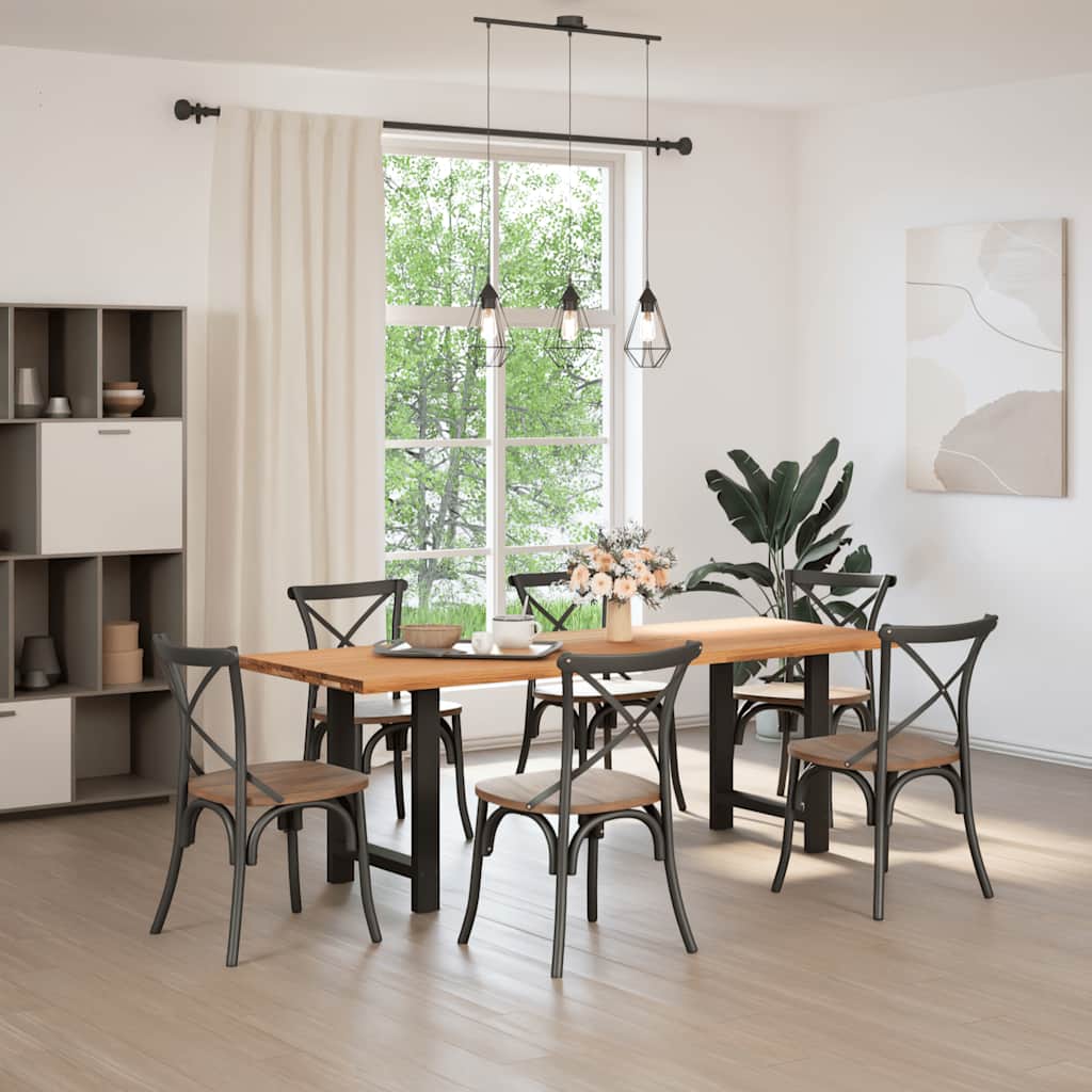 Mach jede Mahlzeit unvergesslich, indem du dich jeden Tag mit deiner Familie oder deinen Freunden um diesen Esstisch aus Holz versammelst! Robustes und langlebiges Material: Massives Eichenholz ist für seine Festigkeit, Haltbarkeit und schöne Maserung bekannt, weshalb es sich hervorragend für haltbare Möbel eignet. Durch seine natürliche Beständigkeit gegen Insektenbefall und Schimmelbildung sehen Eichenmöbel selbst nach jahrelangem Gebrauch brandneu aus.Großer Tisch: Dieser Tisch bietet mit seinen Maßen von 220 x 80 cm viel Platz zum Sitzen und ist das Herzstück deines Essbereichs.Einzigartiger Charme: Da Äste, Risse und Farbabweichungen natürliche Merkmale des Eichenholzes sind, hat jedes Stück dieses Produkts seinen ganz eigenen Charme. Auf den Bildern siehst du Beispiele für die zu erwartenden Variationen.Praktisches Design: Diese Esstischbeine sind mit verstellbaren Nivellierfüßen ausgestattet, die auch auf unebenen Böden für Stabilität sorgen und Bodenkratzer minimieren. Außerdem verfügt die Halterung über vorgebohrte Löcher und mitgelieferte Schrauben, mit denen das Bein an der Tischplatte befestigt werden kann, was die Montage erleichtert.Robustes und stabiles Gestell: Dieser Esszimmertisch hat U-förmige Beine aus pulverbeschichtetem Stahl, die für außergewöhnliche Stabilität und Sicherheit sorgen. Gut zu wissen:Jedes Stück ist ein Unikat, das in Farbe und Maserung variiert. Die Lieferung erfolgt in zufälliger Reihenfolge, wodurch die Exklusivität und Individualität deines Produkts gewährleistet wird.Äste und kleinere Fehler werden mit schwarzem Füllmaterial aufgefüllt, um eine schöne und glatte Tischoberfläche zu erhalten. Beispiele findest du in den Abbildungen.Die Tischplatte ist an den Rändern 4 cm dick, um ein robustes Aussehen zu gewährleisten, und in der Mitte 2 cm dick, um den Holzverbrauch und das Gesamtgewicht zu reduzieren.Bitte bohre die Löcher in der Mitte, nicht an den Rändern der Platte.Bitte achte darauf, die maximale Bohrtiefe von 15 mm nicht zu überschreiten, um die Tischplatte nicht zu beschädigen, da die Plattenstärke 20 mm beträgt.Wir empfehlen, einen Schraubendreher anstelle einer elektrischen Bohrmaschine zu verwenden, um Holzrisse beim Anbringen der Beine zu vermeiden.