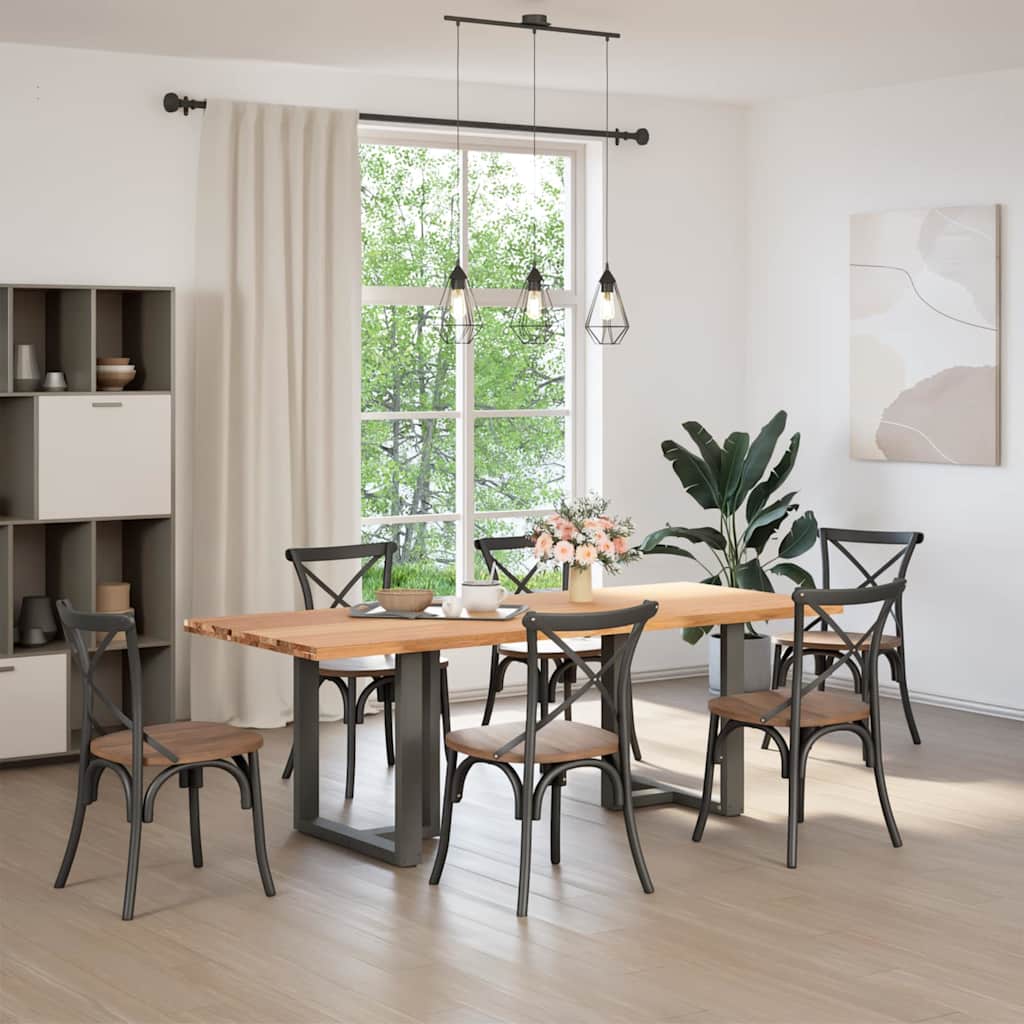 Mach jede Mahlzeit unvergesslich, indem du dich jeden Tag mit deiner Familie oder deinen Freunden um diesen Esstisch aus Holz versammelst! Robustes und langlebiges Material: Massives Eichenholz ist für seine Festigkeit, Haltbarkeit und schöne Maserung bekannt, weshalb es sich hervorragend für haltbare Möbel eignet. Durch seine natürliche Beständigkeit gegen Insektenbefall und Schimmelbildung sehen Eichenmöbel selbst nach jahrelangem Gebrauch brandneu aus.Großer Tisch: Dieser Küchentisch bietet mit seinen Maßen von 220 x 90 cm viel Platz zum Sitzen und ist das Herzstück deines Essbereichs.Einzigartiger Charme: Da Äste, Risse und Farbabweichungen natürliche Merkmale des Eichenholzes sind, hat jedes Stück dieses Produkts seinen ganz eigenen Charme. Auf den Bildern siehst du Beispiele für die zu erwartenden Variationen.Praktisches Design: Diese Esstischbeine sind mit verstellbaren Nivellierfüßen ausgestattet, die auch auf unebenen Böden für Stabilität sorgen und Bodenkratzer minimieren. Außerdem verfügt die Halterung über vorgebohrte Löcher und mitgelieferte Schrauben, mit denen das Bein an der Tischplatte befestigt werden kann, was die Montage erleichtert. Gut zu wissen:Jedes Stück ist ein Unikat, das in Farbe und Maserung variiert. Die Lieferung erfolgt in zufälliger Reihenfolge, wodurch die Exklusivität und Individualität deines Produkts gewährleistet wird.Äste und kleinere Fehler werden mit schwarzem Füllmaterial aufgefüllt, um eine schöne und glatte Tischoberfläche zu erhalten. Beispiele findest du in den Abbildungen.Die Tischplatte ist an den Rändern 4 cm dick, um ein robustes Aussehen zu gewährleisten, und in der Mitte 2 cm dick, um den Holzverbrauch und das Gesamtgewicht zu reduzieren.Bitte bohre die Löcher in der Mitte, nicht an den Rändern der Platte.Bitte achte darauf, die maximale Bohrtiefe von 15 mm nicht zu überschreiten, um die Tischplatte nicht zu beschädigen, da die Plattenstärke 20 mm beträgt.Wir empfehlen, einen Schraubendreher anstelle einer elektrischen Bohrmaschine zu verwenden, um Holzrisse beim Anbringen der Beine zu vermeiden.