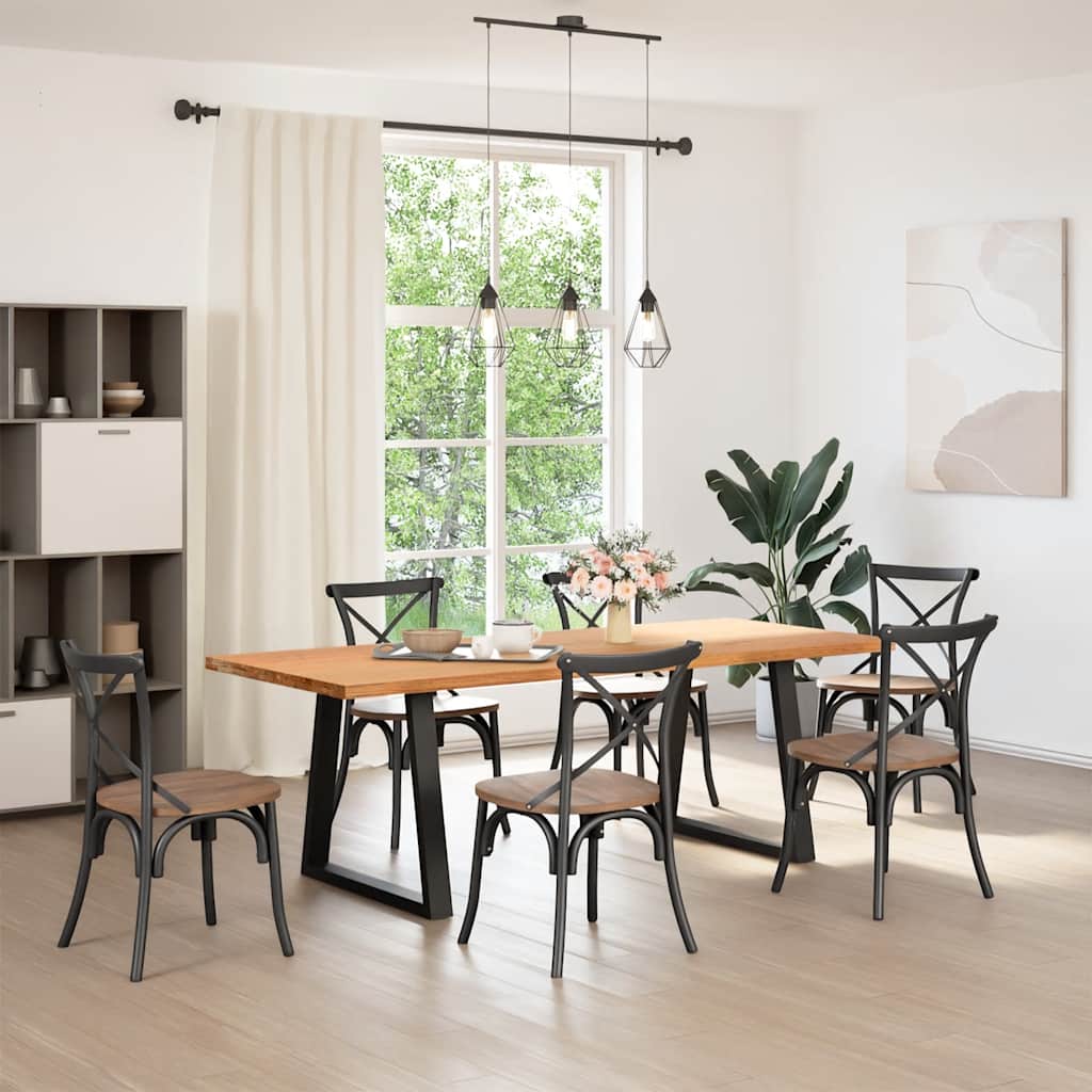 Mach jede Mahlzeit unvergesslich, indem du dich jeden Tag mit deiner Familie oder deinen Freunden um diesen Esstisch aus Holz versammelst! Robustes und langlebiges Material: Massives Eichenholz ist für seine Festigkeit, Haltbarkeit und schöne Maserung bekannt, weshalb es sich hervorragend für haltbare Möbel eignet. Durch seine natürliche Beständigkeit gegen Insektenbefall und Schimmelbildung sehen Eichenmöbel selbst nach jahrelangem Gebrauch brandneu aus.Großer Tisch: Dieser Küchentisch bietet mit seinen Maßen von 220 x 90 cm viel Platz zum Sitzen und ist das Herzstück deines Essbereichs.Einzigartiger Charme: Da Äste, Risse und Farbabweichungen natürliche Merkmale des Eichenholzes sind, hat jedes Stück dieses Produkts seinen ganz eigenen Charme. Auf den Bildern siehst du Beispiele für die zu erwartenden Variationen.Praktisches Design: Diese Esstischbeine sind mit verstellbaren Nivellierfüßen ausgestattet, die auch auf unebenen Böden für Stabilität sorgen und Bodenkratzer minimieren. Außerdem verfügt die Halterung über vorgebohrte Löcher und mitgelieferte Schrauben, mit denen das Bein an der Tischplatte befestigt werden kann, was die Montage erleichtert. Gut zu wissen:Jedes Stück ist ein Unikat, das in Farbe und Maserung variiert. Die Lieferung erfolgt in zufälliger Reihenfolge, wodurch die Exklusivität und Individualität deines Produkts gewährleistet wird.Äste und kleinere Fehler werden mit schwarzem Füllmaterial aufgefüllt, um eine schöne und glatte Tischoberfläche zu erhalten. Beispiele findest du in den Abbildungen.Die Tischplatte ist an den Rändern 4 cm dick, um ein robustes Aussehen zu gewährleisten, und in der Mitte 2 cm dick, um den Holzverbrauch und das Gesamtgewicht zu reduzieren.Bitte bohre die Löcher in der Mitte, nicht an den Rändern der Platte.Bitte achte darauf, die maximale Bohrtiefe von 15 mm nicht zu überschreiten, um die Tischplatte nicht zu beschädigen, da die Plattenstärke 20 mm beträgt.Wir empfehlen, einen Schraubendreher anstelle einer elektrischen Bohrmaschine zu verwenden, um Holzrisse beim Anbringen der Beine zu vermeiden.