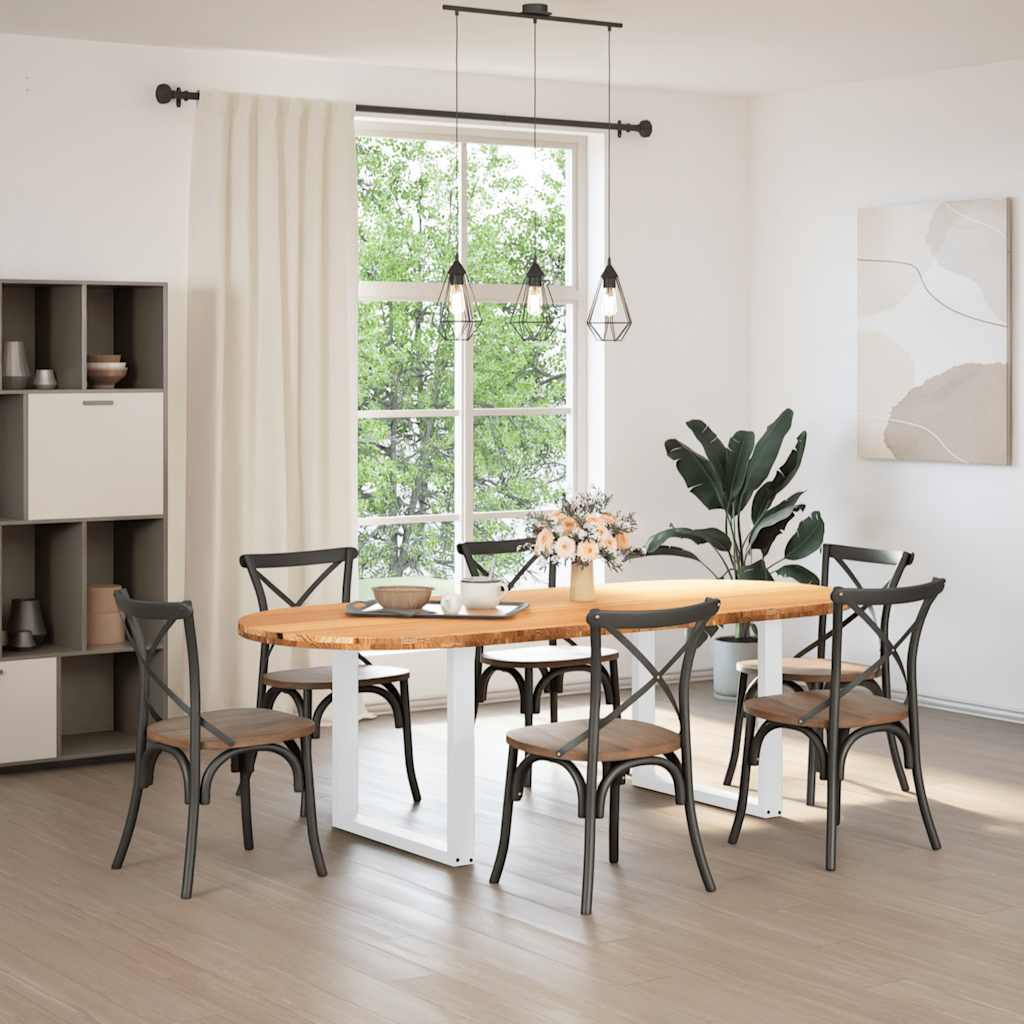 Mach jede Mahlzeit unvergesslich, indem du dich jeden Tag mit deiner Familie oder deinen Freunden um diesen Esstisch aus Holz versammelst! Robustes und langlebiges Material: Massives Eichenholz ist für seine Festigkeit, Haltbarkeit und schöne Maserung bekannt, weshalb es sich hervorragend für haltbare Möbel eignet. Durch seine natürliche Beständigkeit gegen Insektenbefall und Schimmelbildung sehen Eichenmöbel selbst nach jahrelangem Gebrauch brandneu aus.Großer Tisch: Dieser Tisch bietet mit seinen Maßen von 240 x 100 cm viel Platz zum Sitzen und ist das Herzstück deines Essbereichs.Einzigartiger Charme: Da Äste, Risse und Farbabweichungen natürliche Merkmale des Eichenholzes sind, hat jedes Stück dieses Produkts seinen ganz eigenen Charme. Auf den Bildern siehst du Beispiele für die zu erwartenden Variationen.Praktisches Design: Diese Esstischbeine sind mit verstellbaren Nivellierfüßen ausgestattet, die auch auf unebenen Böden für Stabilität sorgen und Bodenkratzer minimieren. Außerdem verfügt die Halterung über vorgebohrte Löcher und mitgelieferte Schrauben, mit denen das Bein an der Tischplatte befestigt werden kann, was die Montage erleichtert.Robustes und stabiles Gestell: Dieser Esszimmertisch hat U-förmige Beine aus pulverbeschichtetem Stahl, die für außergewöhnliche Stabilität und Sicherheit sorgen. Gut zu wissen:Jedes Stück ist ein Unikat, das in Farbe und Maserung variiert. Die Lieferung erfolgt in zufälliger Reihenfolge, wodurch die Exklusivität und Individualität deines Produkts gewährleistet wird.Äste und kleinere Fehler werden mit schwarzem Füllmaterial aufgefüllt, um eine schöne und glatte Tischoberfläche zu erhalten. Beispiele findest du in den Abbildungen.Die Tischplatte ist an den Rändern 4 cm dick, um ein robustes Aussehen zu gewährleisten, und in der Mitte 2 cm dick, um den Holzverbrauch und das Gesamtgewicht zu reduzieren.Bitte bohre die Löcher in der Mitte, nicht an den Rändern der Platte.Bitte achte darauf, die maximale Bohrtiefe von 15 mm nicht zu überschreiten, um die Tischplatte nicht zu beschädigen, da die Plattenstärke 20 mm beträgt.Wir empfehlen, einen Schraubendreher anstelle einer elektrischen Bohrmaschine zu verwenden, um Holzrisse beim Anbringen der Beine zu vermeiden.