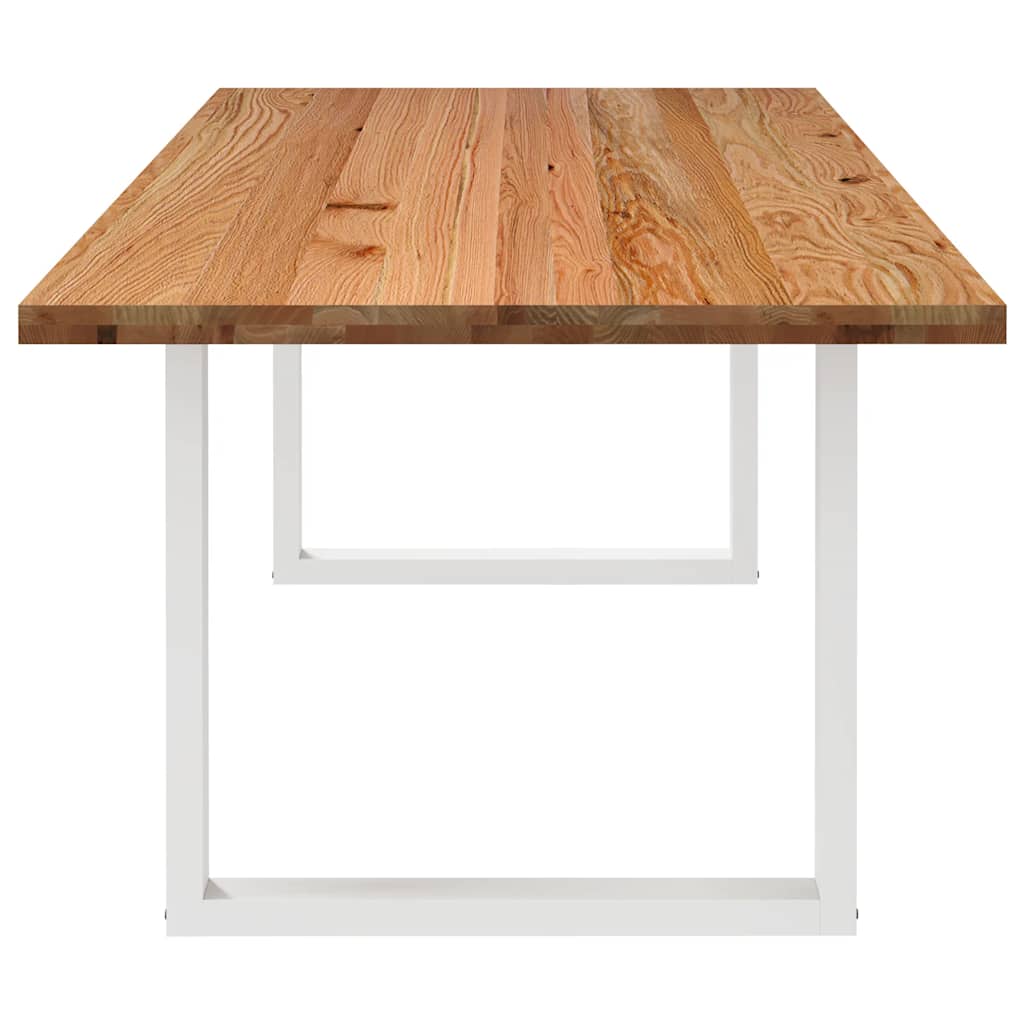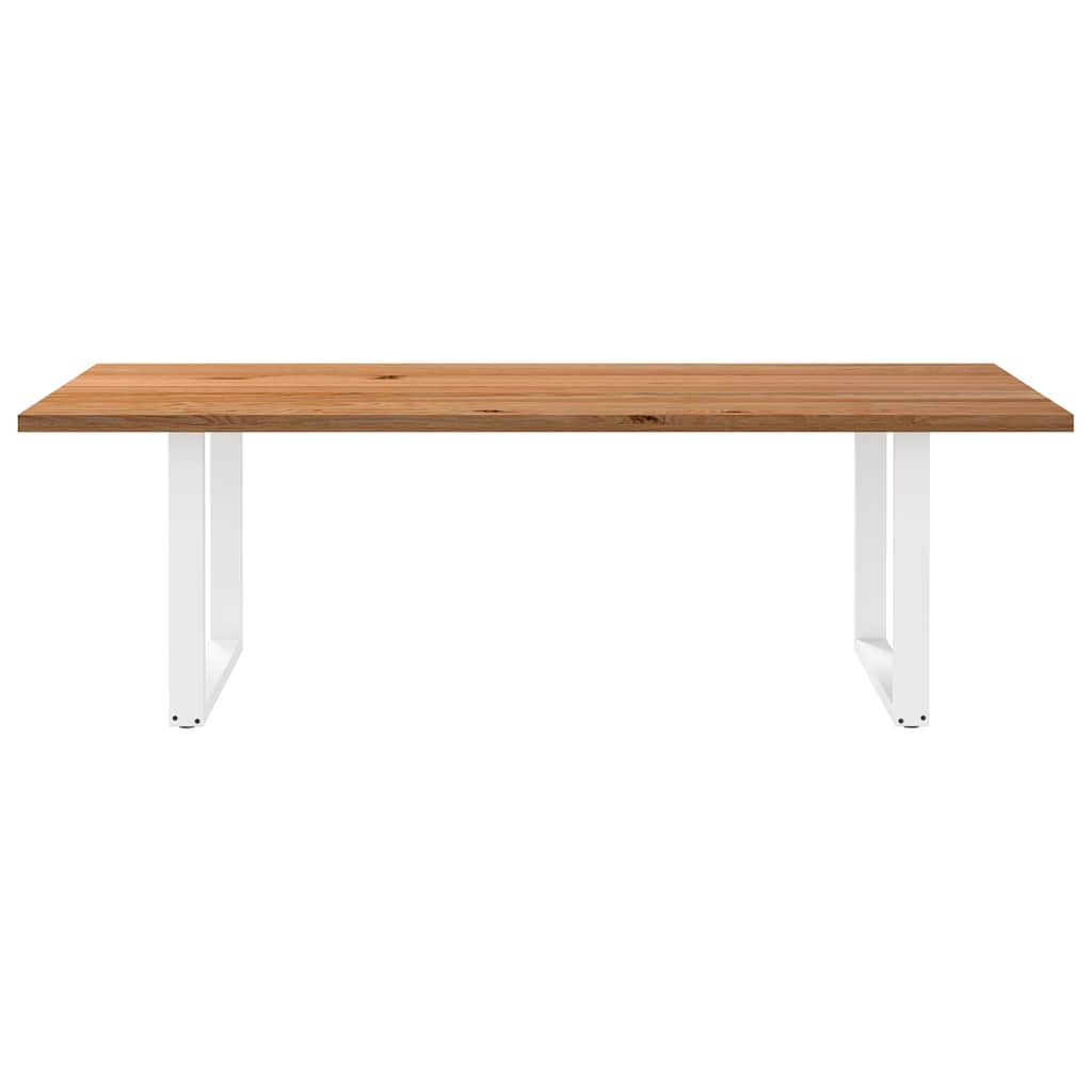 Mach jede Mahlzeit unvergesslich, indem du dich jeden Tag mit deiner Familie oder deinen Freunden um diesen Esstisch aus Holz versammelst! Robustes und langlebiges Material: Massives Eichenholz ist für seine Festigkeit, Haltbarkeit und schöne Maserung bekannt, weshalb es sich hervorragend für haltbare Möbel eignet. Durch seine natürliche Beständigkeit gegen Insektenbefall und Schimmelbildung sehen Eichenmöbel selbst nach jahrelangem Gebrauch brandneu aus.Großer Tisch: Dieser Tisch bietet mit seinen Maßen von 240 x 100 cm viel Platz zum Sitzen und ist das Herzstück deines Essbereichs.Einzigartiger Charme: Da Äste, Risse und Farbabweichungen natürliche Merkmale des Eichenholzes sind, hat jedes Stück dieses Produkts seinen ganz eigenen Charme. Auf den Bildern siehst du Beispiele für die zu erwartenden Variationen.Praktisches Design: Diese Esstischbeine sind mit verstellbaren Nivellierfüßen ausgestattet, die auch auf unebenen Böden für Stabilität sorgen und Bodenkratzer minimieren. Außerdem verfügt die Halterung über vorgebohrte Löcher und mitgelieferte Schrauben, mit denen das Bein an der Tischplatte befestigt werden kann, was die Montage erleichtert.Robustes und stabiles Gestell: Dieser Esszimmertisch hat U-förmige Beine aus pulverbeschichtetem Stahl, die für außergewöhnliche Stabilität und Sicherheit sorgen. Gut zu wissen:Jedes Stück ist ein Unikat, das in Farbe und Maserung variiert. Die Lieferung erfolgt in zufälliger Reihenfolge, wodurch die Exklusivität und Individualität deines Produkts gewährleistet wird.Äste und kleinere Fehler werden mit schwarzem Füllmaterial aufgefüllt, um eine schöne und glatte Tischoberfläche zu erhalten. Beispiele findest du in den Abbildungen.Die Tischplatte ist an den Rändern 4 cm dick, um ein robustes Aussehen zu gewährleisten, und in der Mitte 2 cm dick, um den Holzverbrauch und das Gesamtgewicht zu reduzieren.Bitte bohre die Löcher in der Mitte, nicht an den Rändern der Platte.Bitte achte darauf, die maximale Bohrtiefe von 15 mm nicht zu überschreiten, um die Tischplatte nicht zu beschädigen, da die Plattenstärke 20 mm beträgt.Wir empfehlen, einen Schraubendreher anstelle einer elektrischen Bohrmaschine zu verwenden, um Holzrisse beim Anbringen der Beine zu vermeiden.
