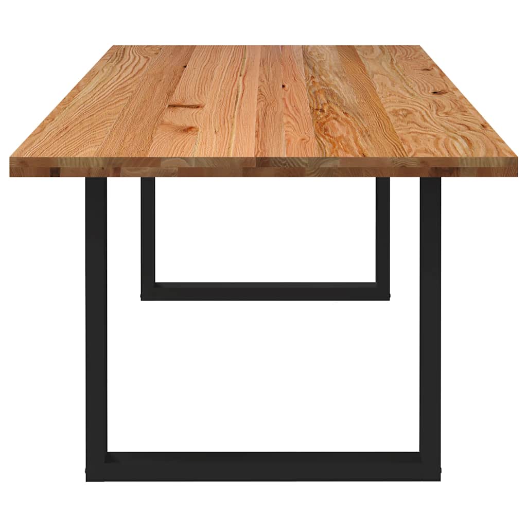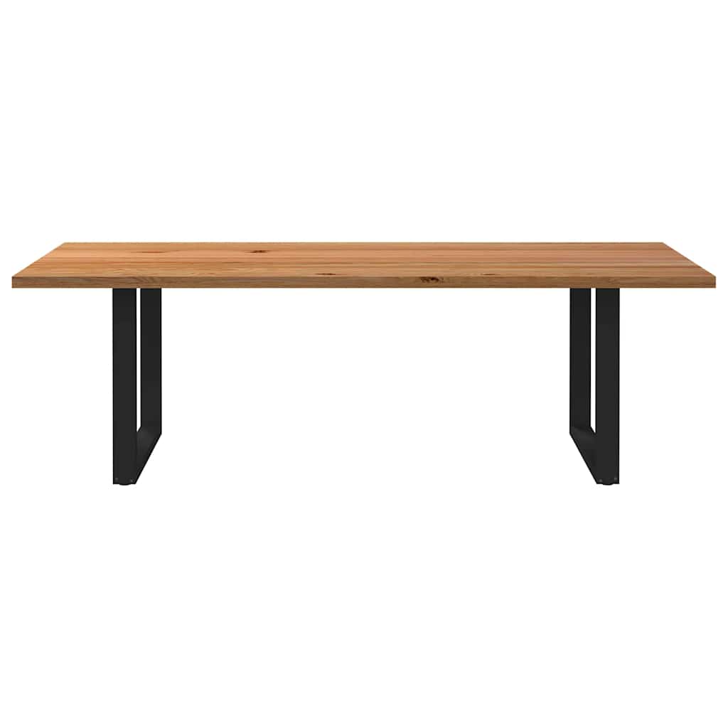 Mach jede Mahlzeit unvergesslich, indem du dich jeden Tag mit deiner Familie oder deinen Freunden um diesen Esstisch aus Holz versammelst! Robustes und langlebiges Material: Massives Eichenholz ist für seine Festigkeit, Haltbarkeit und schöne Maserung bekannt, weshalb es sich hervorragend für haltbare Möbel eignet. Durch seine natürliche Beständigkeit gegen Insektenbefall und Schimmelbildung sehen Eichenmöbel selbst nach jahrelangem Gebrauch brandneu aus.Großer Tisch: Dieser Tisch bietet mit seinen Maßen von 240 x 100 cm viel Platz zum Sitzen und ist das Herzstück deines Essbereichs.Einzigartiger Charme: Da Äste, Risse und Farbabweichungen natürliche Merkmale des Eichenholzes sind, hat jedes Stück dieses Produkts seinen ganz eigenen Charme. Auf den Bildern siehst du Beispiele für die zu erwartenden Variationen.Praktisches Design: Diese Esstischbeine sind mit verstellbaren Nivellierfüßen ausgestattet, die auch auf unebenen Böden für Stabilität sorgen und Bodenkratzer minimieren. Außerdem verfügt die Halterung über vorgebohrte Löcher und mitgelieferte Schrauben, mit denen das Bein an der Tischplatte befestigt werden kann, was die Montage erleichtert.Robustes und stabiles Gestell: Dieser Esszimmertisch hat U-förmige Beine aus pulverbeschichtetem Stahl, die für außergewöhnliche Stabilität und Sicherheit sorgen. Gut zu wissen:Jedes Stück ist ein Unikat, das in Farbe und Maserung variiert. Die Lieferung erfolgt in zufälliger Reihenfolge, wodurch die Exklusivität und Individualität deines Produkts gewährleistet wird.Äste und kleinere Fehler werden mit schwarzem Füllmaterial aufgefüllt, um eine schöne und glatte Tischoberfläche zu erhalten. Beispiele findest du in den Abbildungen.Die Tischplatte ist an den Rändern 4 cm dick, um ein robustes Aussehen zu gewährleisten, und in der Mitte 2 cm dick, um den Holzverbrauch und das Gesamtgewicht zu reduzieren.Bitte bohre die Löcher in der Mitte, nicht an den Rändern der Platte.Bitte achte darauf, die maximale Bohrtiefe von 15 mm nicht zu überschreiten, um die Tischplatte nicht zu beschädigen, da die Plattenstärke 20 mm beträgt.Wir empfehlen, einen Schraubendreher anstelle einer elektrischen Bohrmaschine zu verwenden, um Holzrisse beim Anbringen der Beine zu vermeiden.