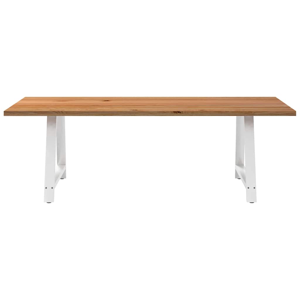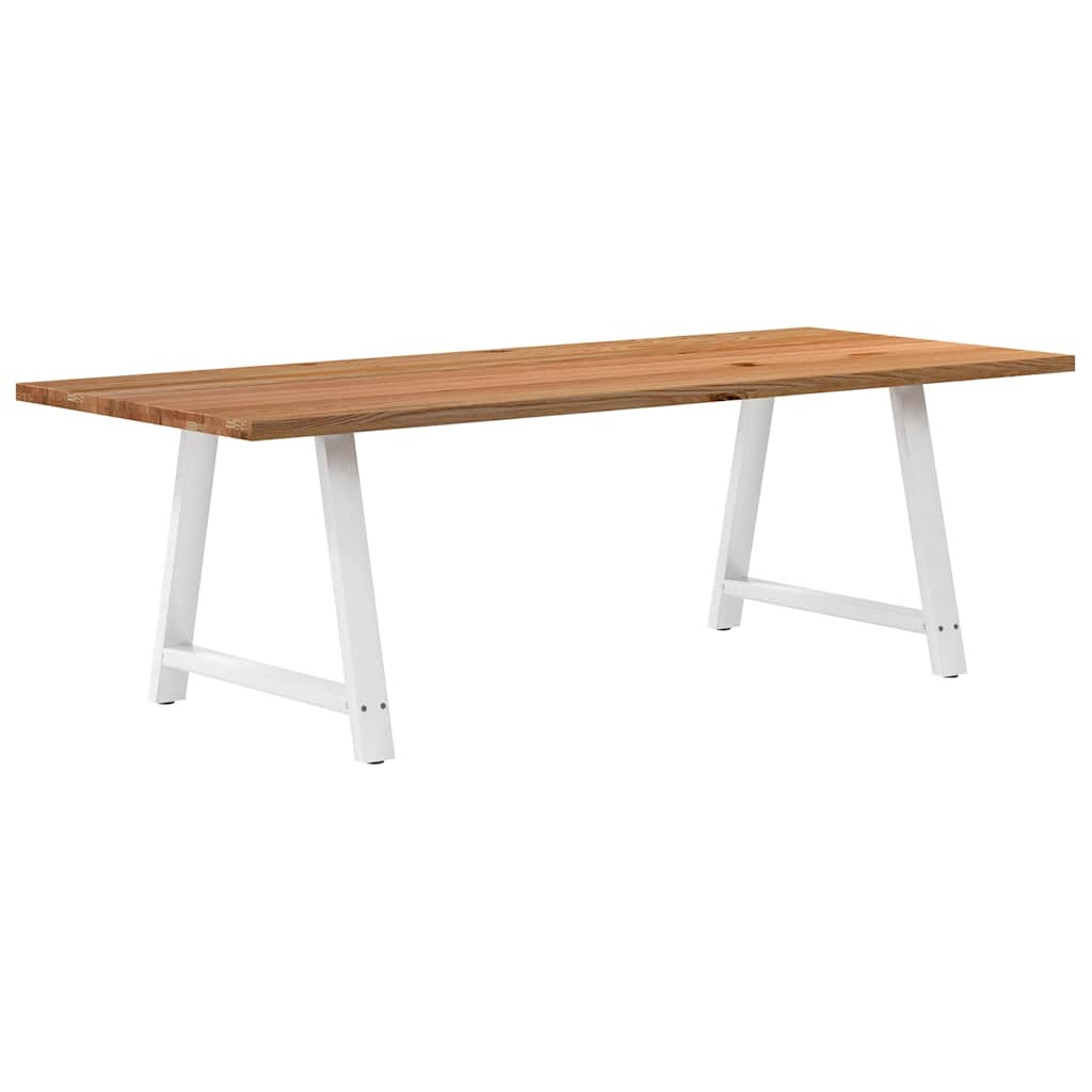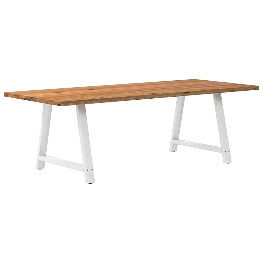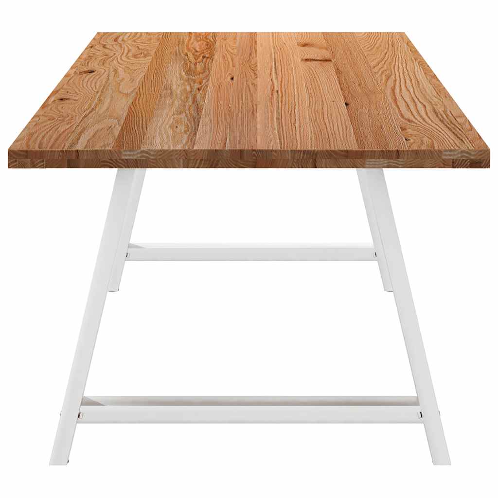Mach jede Mahlzeit unvergesslich, indem du dich jeden Tag mit deiner Familie oder deinen Freunden um diesen Esstisch aus Holz versammelst! Robustes und langlebiges Material: Massives Eichenholz ist für seine Festigkeit, Haltbarkeit und schöne Maserung bekannt, weshalb es sich hervorragend für haltbare Möbel eignet. Durch seine natürliche Beständigkeit gegen Insektenbefall und Schimmelbildung sehen Eichenmöbel selbst nach jahrelangem Gebrauch brandneu aus.Großer Tisch: Dieser Tisch bietet mit seinen Maßen von 240 x 100 cm viel Platz zum Sitzen und ist das Herzstück deines Essbereichs.Einzigartiger Charme: Da Äste, Risse und Farbabweichungen natürliche Merkmale des Eichenholzes sind, hat jedes Stück dieses Produkts seinen ganz eigenen Charme. Auf den Bildern siehst du Beispiele für die zu erwartenden Variationen.Praktisches Design: Diese Esstischbeine sind mit verstellbaren Nivellierfüßen ausgestattet, die auch auf unebenen Böden für Stabilität sorgen und Bodenkratzer minimieren. Außerdem verfügt die Halterung über vorgebohrte Löcher und mitgelieferte Schrauben, mit denen das Bein an der Tischplatte befestigt werden kann, was die Montage erleichtert.Robustes und stabiles Gestell: Dieser Esszimmertisch hat A-förmige Beine aus pulverbeschichtetem Stahl, die für außergewöhnliche Stabilität und Sicherheit sorgen. Gut zu wissen:Jedes Stück ist ein Unikat, das in Farbe und Maserung variiert. Die Lieferung erfolgt in zufälliger Reihenfolge, wodurch die Exklusivität und Individualität deines Produkts gewährleistet wird.Äste und kleinere Fehler werden mit schwarzem Füllmaterial aufgefüllt, um eine schöne und glatte Tischoberfläche zu erhalten. Beispiele findest du in den Abbildungen.Die Tischplatte ist an den Rändern 4 cm dick, um ein robustes Aussehen zu gewährleisten, und in der Mitte 2 cm dick, um den Holzverbrauch und das Gesamtgewicht zu reduzieren.Bitte bohre die Löcher in der Mitte, nicht an den Rändern der Platte.Bitte achte darauf, die maximale Bohrtiefe von 15 mm nicht zu überschreiten, um die Tischplatte nicht zu beschädigen, da die Plattenstärke 20 mm beträgt.Wir empfehlen, einen Schraubendreher anstelle einer elektrischen Bohrmaschine zu verwenden, um Holzrisse beim Anbringen der Beine zu vermeiden.