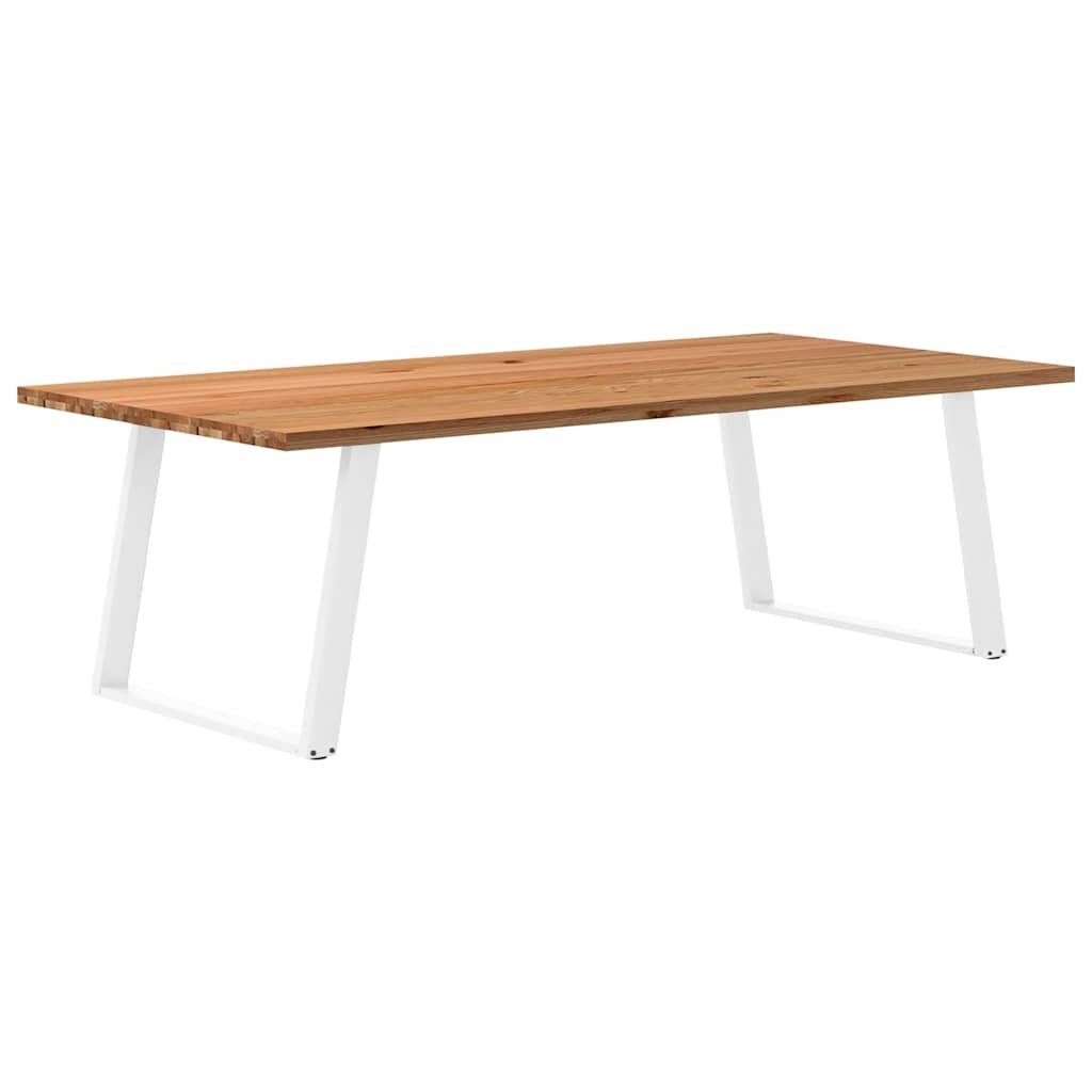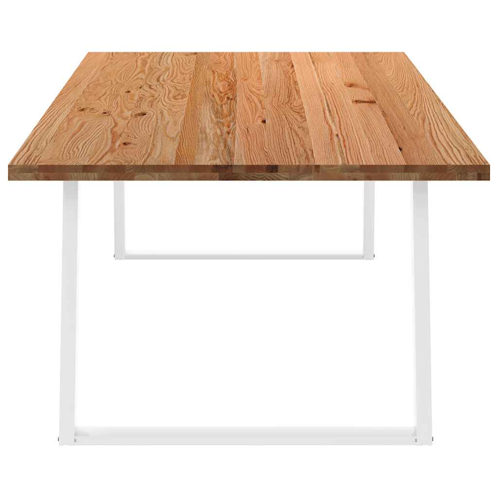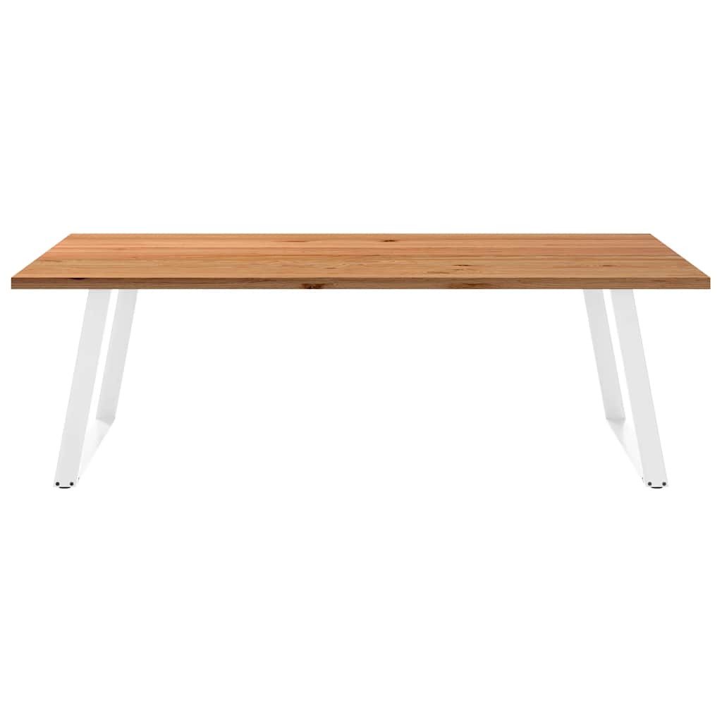 Mach jede Mahlzeit unvergesslich, indem du dich jeden Tag mit deiner Familie oder deinen Freunden um diesen Esstisch aus Holz versammelst! Robustes und langlebiges Material: Massives Eichenholz ist für seine Festigkeit, Haltbarkeit und schöne Maserung bekannt, weshalb es sich hervorragend für haltbare Möbel eignet. Durch seine natürliche Beständigkeit gegen Insektenbefall und Schimmelbildung sehen Eichenmöbel selbst nach jahrelangem Gebrauch brandneu aus.Großer Tisch: Dieser Tisch bietet mit seinen Maßen von 240 x 120 cm viel Platz zum Sitzen und ist das Herzstück deines Essbereichs.Einzigartiger Charme: Da Äste, Risse und Farbabweichungen natürliche Merkmale des Eichenholzes sind, hat jedes Stück dieses Produkts seinen ganz eigenen Charme. Auf den Bildern siehst du Beispiele für die zu erwartenden Variationen.Praktisches Design: Diese Esstischbeine sind mit verstellbaren Nivellierfüßen ausgestattet, die auch auf unebenen Böden für Stabilität sorgen und Bodenkratzer minimieren. Außerdem verfügt die Halterung über vorgebohrte Löcher und mitgelieferte Schrauben, mit denen das Bein an der Tischplatte befestigt werden kann, was die Montage erleichtert.Robustes und stabiles Gestell: Dieser Esszimmertisch hat U-förmige Beine aus pulverbeschichtetem Stahl, die für außergewöhnliche Stabilität und Sicherheit sorgen. Gut zu wissen:Jedes Stück ist ein Unikat, das in Farbe und Maserung variiert. Die Lieferung erfolgt in zufälliger Reihenfolge, wodurch die Exklusivität und Individualität deines Produkts gewährleistet wird.Äste und kleinere Fehler werden mit schwarzem Füllmaterial aufgefüllt, um eine schöne und glatte Tischoberfläche zu erhalten. Beispiele findest du in den Abbildungen.Die Tischplatte ist an den Rändern 4 cm dick, um ein robustes Aussehen zu gewährleisten, und in der Mitte 2 cm dick, um den Holzverbrauch und das Gesamtgewicht zu reduzieren.Bitte bohre die Löcher in der Mitte, nicht an den Rändern der Platte.Bitte achte darauf, die maximale Bohrtiefe von 15 mm nicht zu überschreiten, um die Tischplatte nicht zu beschädigen, da die Plattenstärke 20 mm beträgt.Wir empfehlen, einen Schraubendreher anstelle einer elektrischen Bohrmaschine zu verwenden, um Holzrisse beim Anbringen der Beine zu vermeiden.