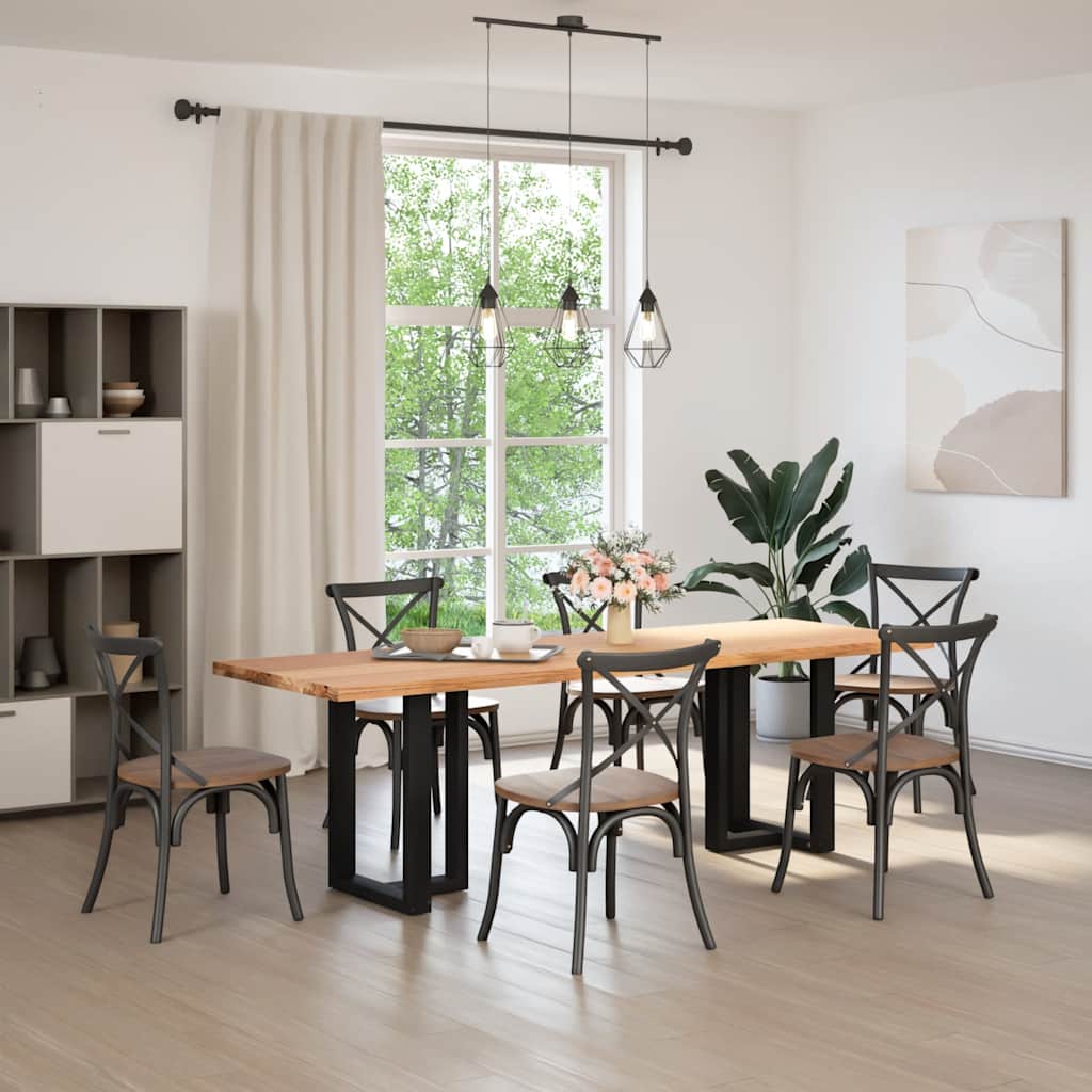 Mach jede Mahlzeit unvergesslich, indem du dich jeden Tag mit deiner Familie oder deinen Freunden um diesen Esstisch aus Holz versammelst! Robustes und langlebiges Material: Massives Eichenholz ist für seine Festigkeit, Haltbarkeit und schöne Maserung bekannt, weshalb es sich hervorragend für haltbare Möbel eignet. Durch seine natürliche Beständigkeit gegen Insektenbefall und Schimmelbildung sehen Eichenmöbel selbst nach jahrelangem Gebrauch brandneu aus.Großer Tisch: Dieser Küchentisch bietet mit seinen Maßen von 240 x 80 cm viel Platz zum Sitzen und ist das Herzstück deines Essbereichs.Einzigartiger Charme: Da Äste, Risse und Farbabweichungen natürliche Merkmale des Eichenholzes sind, hat jedes Stück dieses Produkts seinen ganz eigenen Charme. Auf den Bildern siehst du Beispiele für die zu erwartenden Variationen.Praktisches Design: Diese Esstischbeine sind mit verstellbaren Nivellierfüßen ausgestattet, die auch auf unebenen Böden für Stabilität sorgen und Bodenkratzer minimieren. Außerdem verfügt die Halterung über vorgebohrte Löcher und mitgelieferte Schrauben, mit denen das Bein an der Tischplatte befestigt werden kann, was die Montage erleichtert. Gut zu wissen:Jedes Stück ist ein Unikat, das in Farbe und Maserung variiert. Die Lieferung erfolgt in zufälliger Reihenfolge, wodurch die Exklusivität und Individualität deines Produkts gewährleistet wird.Äste und kleinere Fehler werden mit schwarzem Füllmaterial aufgefüllt, um eine schöne und glatte Tischoberfläche zu erhalten. Beispiele findest du in den Abbildungen.Die Tischplatte ist an den Rändern 4 cm dick, um ein robustes Aussehen zu gewährleisten, und in der Mitte 2 cm dick, um den Holzverbrauch und das Gesamtgewicht zu reduzieren.Bitte bohre die Löcher in der Mitte, nicht an den Rändern der Platte.Bitte achte darauf, die maximale Bohrtiefe von 15 mm nicht zu überschreiten, um die Tischplatte nicht zu beschädigen, da die Plattenstärke 20 mm beträgt.Wir empfehlen, einen Schraubendreher anstelle einer elektrischen Bohrmaschine zu verwenden, um Holzrisse beim Anbringen der Beine zu vermeiden.