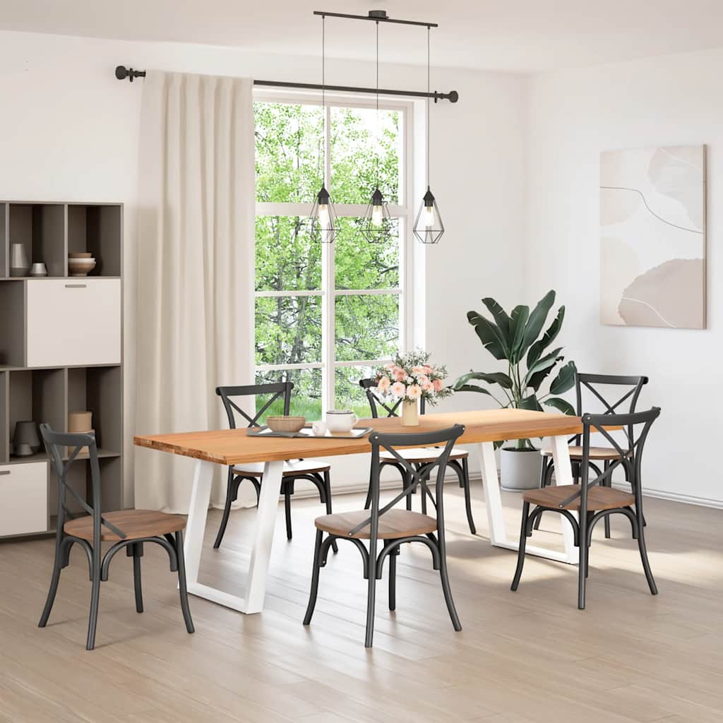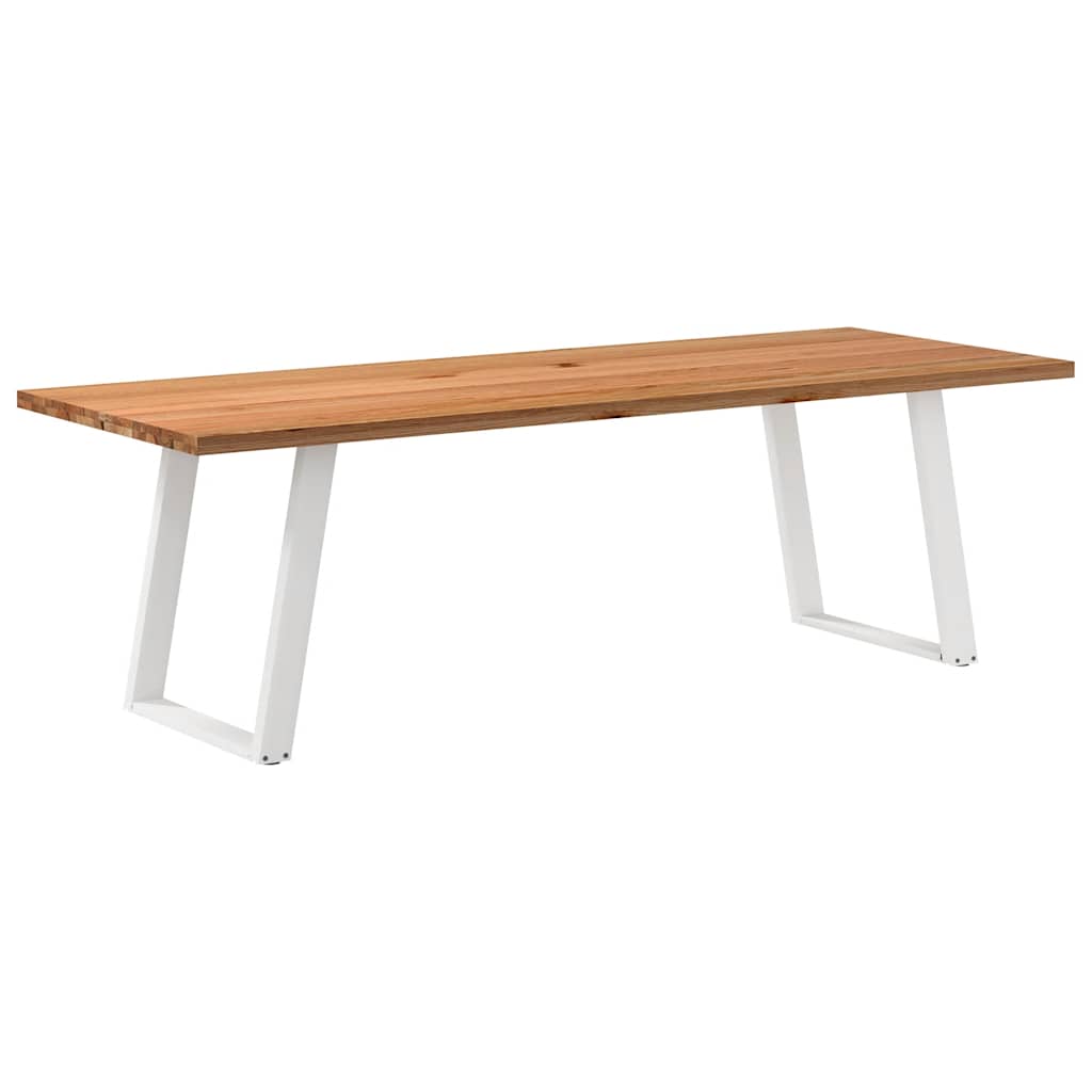 Mach jede Mahlzeit unvergesslich, indem du dich jeden Tag mit deiner Familie oder deinen Freunden um diesen Esstisch aus Holz versammelst! Robustes und langlebiges Material: Massives Eichenholz ist für seine Festigkeit, Haltbarkeit und schöne Maserung bekannt, weshalb es sich hervorragend für haltbare Möbel eignet. Durch seine natürliche Beständigkeit gegen Insektenbefall und Schimmelbildung sehen Eichenmöbel selbst nach jahrelangem Gebrauch brandneu aus.Großer Tisch: Dieser Tisch bietet mit seinen Maßen von 240 x 90 cm viel Platz zum Sitzen und ist das Herzstück deines Essbereichs.Einzigartiger Charme: Da Äste, Risse und Farbabweichungen natürliche Merkmale des Eichenholzes sind, hat jedes Stück dieses Produkts seinen ganz eigenen Charme. Auf den Bildern siehst du Beispiele für die zu erwartenden Variationen.Praktisches Design: Diese Esstischbeine sind mit verstellbaren Nivellierfüßen ausgestattet, die auch auf unebenen Böden für Stabilität sorgen und Bodenkratzer minimieren. Außerdem verfügt die Halterung über vorgebohrte Löcher und mitgelieferte Schrauben, mit denen das Bein an der Tischplatte befestigt werden kann, was die Montage erleichtert.Robustes und stabiles Gestell: Dieser Esszimmertisch hat U-förmige Beine aus pulverbeschichtetem Stahl, die für außergewöhnliche Stabilität und Sicherheit sorgen. Gut zu wissen:Jedes Stück ist ein Unikat, das in Farbe und Maserung variiert. Die Lieferung erfolgt in zufälliger Reihenfolge, wodurch die Exklusivität und Individualität deines Produkts gewährleistet wird.Äste und kleinere Fehler werden mit schwarzem Füllmaterial aufgefüllt, um eine schöne und glatte Tischoberfläche zu erhalten. Beispiele findest du in den Abbildungen.Die Tischplatte ist an den Rändern 4 cm dick, um ein robustes Aussehen zu gewährleisten, und in der Mitte 2 cm dick, um den Holzverbrauch und das Gesamtgewicht zu reduzieren.Bitte bohre die Löcher in der Mitte, nicht an den Rändern der Platte.Bitte achte darauf, die maximale Bohrtiefe von 15 mm nicht zu überschreiten, um die Tischplatte nicht zu beschädigen, da die Plattenstärke 20 mm beträgt.Wir empfehlen, einen Schraubendreher anstelle einer elektrischen Bohrmaschine zu verwenden, um Holzrisse beim Anbringen der Beine zu vermeiden.