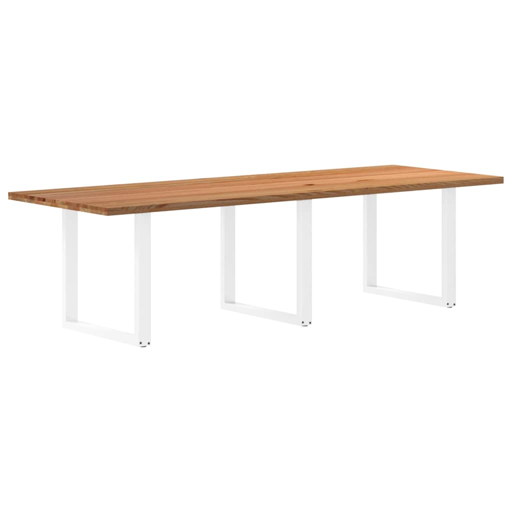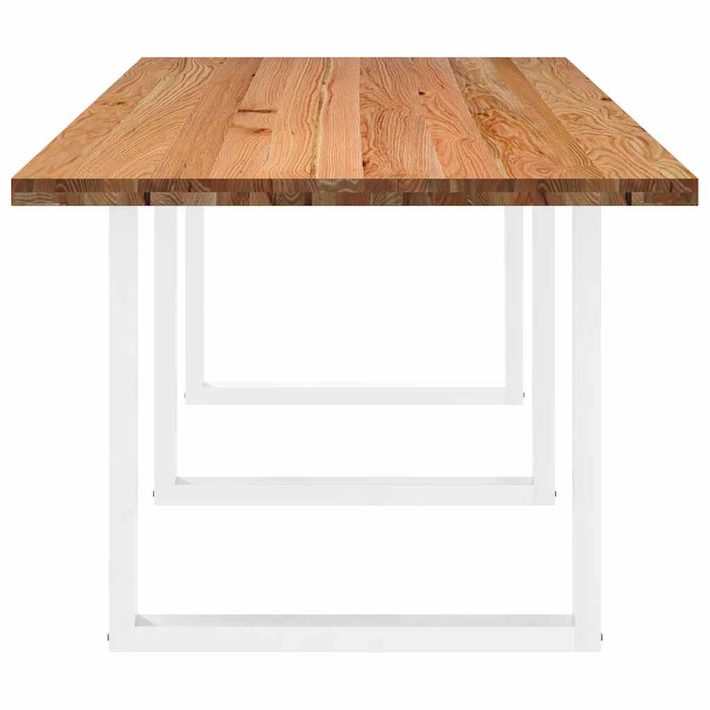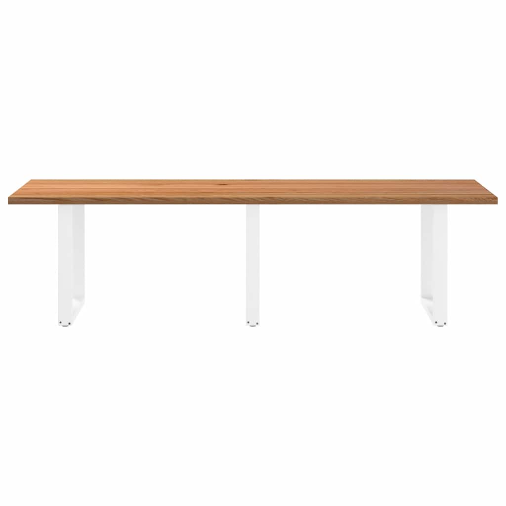 Mach jede Mahlzeit unvergesslich, indem du dich jeden Tag mit deiner Familie oder deinen Freunden um diesen Esstisch aus Holz versammelst! Robustes und langlebiges Material: Massives Eichenholz ist für seine Festigkeit, Haltbarkeit und schöne Maserung bekannt, weshalb es sich hervorragend für haltbare Möbel eignet. Durch seine natürliche Beständigkeit gegen Insektenbefall und Schimmelbildung sehen Eichenmöbel selbst nach jahrelangem Gebrauch brandneu aus.Großer Tisch: Dieser Tisch bietet mit seinen Maßen von 280 x 100 cm viel Platz zum Sitzen und ist das Herzstück deines Essbereichs.Einzigartiger Charme: Da Äste, Risse und Farbabweichungen natürliche Merkmale des Eichenholzes sind, hat jedes Stück dieses Produkts seinen ganz eigenen Charme. Auf den Bildern siehst du Beispiele für die zu erwartenden Variationen.Praktisches Design: Diese Esstischbeine sind mit verstellbaren Nivellierfüßen ausgestattet, die auch auf unebenen Böden für Stabilität sorgen und Bodenkratzer minimieren. Außerdem verfügt die Halterung über vorgebohrte Löcher und mitgelieferte Schrauben, mit denen das Bein an der Tischplatte befestigt werden kann, was die Montage erleichtert.Robustes und stabiles Gestell: Dieser Esszimmertisch hat U-förmige Beine aus pulverbeschichtetem Stahl, die für außergewöhnliche Stabilität und Sicherheit sorgen. Gut zu wissen:Jedes Stück ist ein Unikat, das in Farbe und Maserung variiert. Die Lieferung erfolgt in zufälliger Reihenfolge, wodurch die Exklusivität und Individualität deines Produkts gewährleistet wird.Äste und kleinere Fehler werden mit schwarzem Füllmaterial aufgefüllt, um eine schöne und glatte Tischoberfläche zu erhalten. Beispiele findest du in den Abbildungen.Die Tischplatte ist an den Rändern 4 cm dick, um ein robustes Aussehen zu gewährleisten, und in der Mitte 2 cm dick, um den Holzverbrauch und das Gesamtgewicht zu reduzieren.Bitte bohre die Löcher in der Mitte, nicht an den Rändern der Platte.Bitte achte darauf, die maximale Bohrtiefe von 15 mm nicht zu überschreiten, um die Tischplatte nicht zu beschädigen, da die Plattenstärke 20 mm beträgt.Wir empfehlen, einen Schraubendreher anstelle einer elektrischen Bohrmaschine zu verwenden, um Holzrisse beim Anbringen der Beine zu vermeiden.