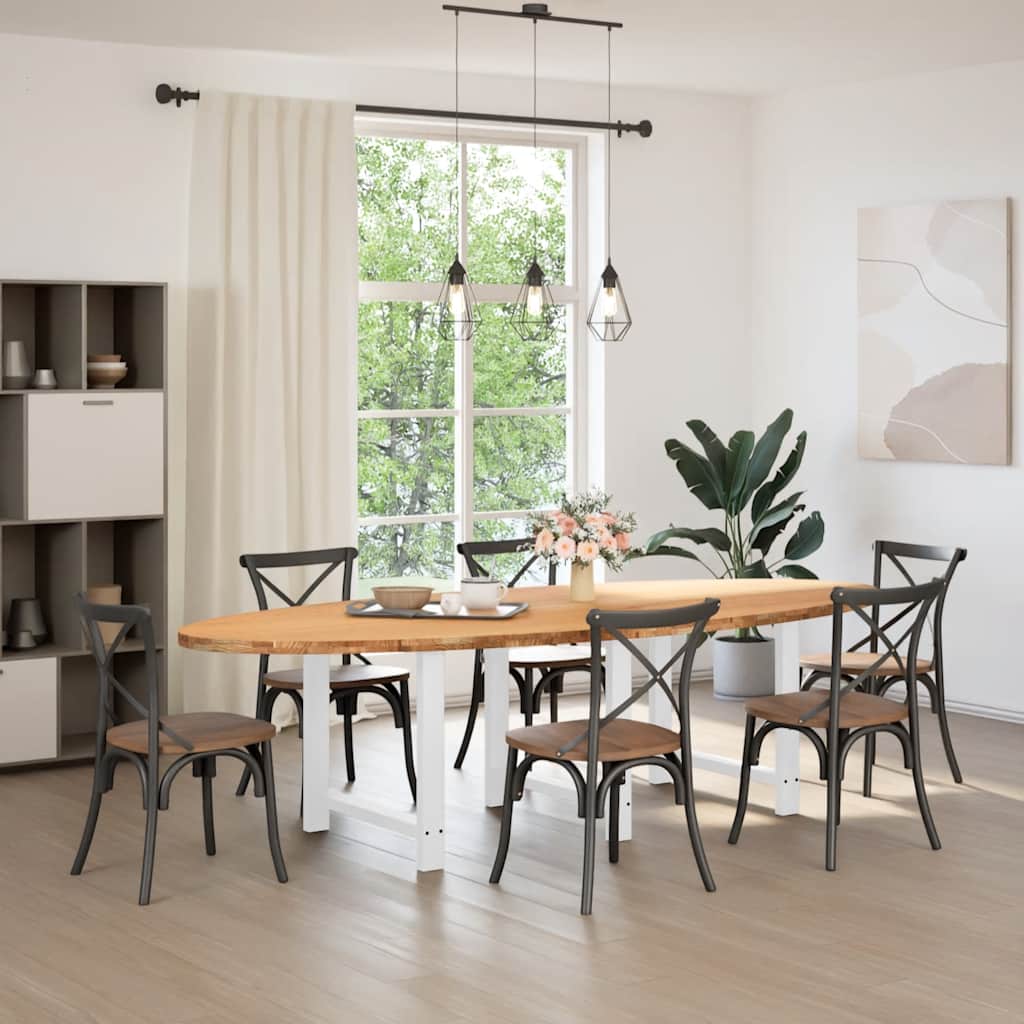 Mach jede Mahlzeit unvergesslich, indem du dich jeden Tag mit deiner Familie oder deinen Freunden um diesen Esstisch aus Holz versammelst! Robustes und langlebiges Material: Massives Eichenholz ist für seine Festigkeit, Haltbarkeit und schöne Maserung bekannt, weshalb es sich hervorragend für haltbare Möbel eignet. Durch seine natürliche Beständigkeit gegen Insektenbefall und Schimmelbildung sehen Eichenmöbel selbst nach jahrelangem Gebrauch brandneu aus.Großer Tisch: Dieser Küchentisch bietet mit seinen Maßen von 280 x 120 cm viel Platz zum Sitzen und ist das Herzstück deines Essbereichs.Einzigartiger Charme: Da Äste, Risse und Farbabweichungen natürliche Merkmale des Eichenholzes sind, hat jedes Stück dieses Produkts seinen ganz eigenen Charme. Auf den Bildern siehst du Beispiele für die zu erwartenden Variationen.Praktisches Design: Diese Esstischbeine sind mit verstellbaren Nivellierfüßen ausgestattet, die auch auf unebenen Böden für Stabilität sorgen und Bodenkratzer minimieren. Außerdem verfügt die Halterung über vorgebohrte Löcher und mitgelieferte Schrauben, mit denen das Bein an der Tischplatte befestigt werden kann, was die Montage erleichtert. Gut zu wissen:Jedes Stück ist ein Unikat, das in Farbe und Maserung variiert. Die Lieferung erfolgt in zufälliger Reihenfolge, wodurch die Exklusivität und Individualität deines Produkts gewährleistet wird.Äste und kleinere Fehler werden mit schwarzem Füllmaterial aufgefüllt, um eine schöne und glatte Tischoberfläche zu erhalten. Beispiele findest du in den Abbildungen.Die Tischplatte ist an den Rändern 4 cm dick, um ein robustes Aussehen zu gewährleisten, und in der Mitte 2 cm dick, um den Holzverbrauch und das Gesamtgewicht zu reduzieren.Bitte bohre die Löcher in der Mitte, nicht an den Rändern der Platte.Bitte achte darauf, die maximale Bohrtiefe von 15 mm nicht zu überschreiten, um die Tischplatte nicht zu beschädigen, da die Plattenstärke 20 mm beträgt.Wir empfehlen, einen Schraubendreher anstelle einer elektrischen Bohrmaschine zu verwenden, um Holzrisse beim Anbringen der Beine zu vermeiden.