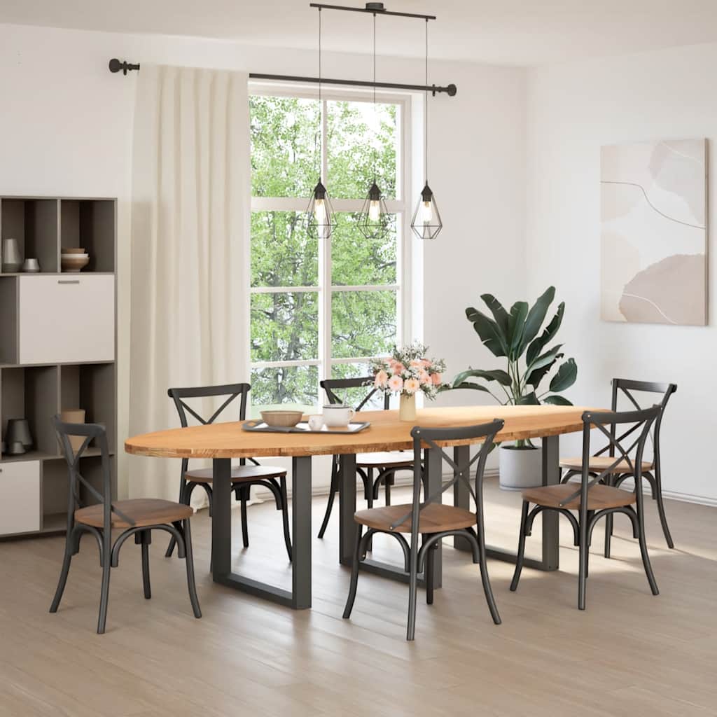 Mach jede Mahlzeit unvergesslich, indem du dich jeden Tag mit deiner Familie oder deinen Freunden um diesen Esstisch aus Holz versammelst! Robustes und langlebiges Material: Massives Eichenholz ist für seine Festigkeit, Haltbarkeit und schöne Maserung bekannt, weshalb es sich hervorragend für haltbare Möbel eignet. Durch seine natürliche Beständigkeit gegen Insektenbefall und Schimmelbildung sehen Eichenmöbel selbst nach jahrelangem Gebrauch brandneu aus.Großer Tisch: Dieser Küchentisch bietet mit seinen Maßen von 280 x 120 cm viel Platz zum Sitzen und ist das Herzstück deines Essbereichs.Einzigartiger Charme: Da Äste, Risse und Farbabweichungen natürliche Merkmale des Eichenholzes sind, hat jedes Stück dieses Produkts seinen ganz eigenen Charme. Auf den Bildern siehst du Beispiele für die zu erwartenden Variationen.Praktisches Design: Diese Esstischbeine sind mit verstellbaren Nivellierfüßen ausgestattet, die auch auf unebenen Böden für Stabilität sorgen und Bodenkratzer minimieren. Außerdem verfügt die Halterung über vorgebohrte Löcher und mitgelieferte Schrauben, mit denen das Bein an der Tischplatte befestigt werden kann, was die Montage erleichtert. Gut zu wissen:Jedes Stück ist ein Unikat, das in Farbe und Maserung variiert. Die Lieferung erfolgt in zufälliger Reihenfolge, wodurch die Exklusivität und Individualität deines Produkts gewährleistet wird.Äste und kleinere Fehler werden mit schwarzem Füllmaterial aufgefüllt, um eine schöne und glatte Tischoberfläche zu erhalten. Beispiele findest du in den Abbildungen.Die Tischplatte ist an den Rändern 4 cm dick, um ein robustes Aussehen zu gewährleisten, und in der Mitte 2 cm dick, um den Holzverbrauch und das Gesamtgewicht zu reduzieren.Bitte bohre die Löcher in der Mitte, nicht an den Rändern der Platte.Bitte achte darauf, die maximale Bohrtiefe von 15 mm nicht zu überschreiten, um die Tischplatte nicht zu beschädigen, da die Plattenstärke 20 mm beträgt.Wir empfehlen, einen Schraubendreher anstelle einer elektrischen Bohrmaschine zu verwenden, um Holzrisse beim Anbringen der Beine zu vermeiden.