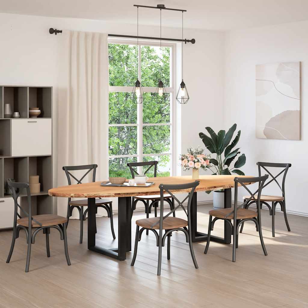 Mach jede Mahlzeit unvergesslich, indem du dich jeden Tag mit deiner Familie oder deinen Freunden um diesen Esstisch aus Holz versammelst! Robustes und langlebiges Material: Massives Eichenholz ist für seine Festigkeit, Haltbarkeit und schöne Maserung bekannt, weshalb es sich hervorragend für haltbare Möbel eignet. Durch seine natürliche Beständigkeit gegen Insektenbefall und Schimmelbildung sehen Eichenmöbel selbst nach jahrelangem Gebrauch brandneu aus.Großer Tisch: Dieser Küchentisch bietet mit seinen Maßen von 280 x 120 cm viel Platz zum Sitzen und ist das Herzstück deines Essbereichs.Einzigartiger Charme: Da Äste, Risse und Farbabweichungen natürliche Merkmale des Eichenholzes sind, hat jedes Stück dieses Produkts seinen ganz eigenen Charme. Auf den Bildern siehst du Beispiele für die zu erwartenden Variationen.Praktisches Design: Diese Esstischbeine sind mit verstellbaren Nivellierfüßen ausgestattet, die auch auf unebenen Böden für Stabilität sorgen und Bodenkratzer minimieren. Außerdem verfügt die Halterung über vorgebohrte Löcher und mitgelieferte Schrauben, mit denen das Bein an der Tischplatte befestigt werden kann, was die Montage erleichtert. Gut zu wissen:Jedes Stück ist ein Unikat, das in Farbe und Maserung variiert. Die Lieferung erfolgt in zufälliger Reihenfolge, wodurch die Exklusivität und Individualität deines Produkts gewährleistet wird.Äste und kleinere Fehler werden mit schwarzem Füllmaterial aufgefüllt, um eine schöne und glatte Tischoberfläche zu erhalten. Beispiele findest du in den Abbildungen.Die Tischplatte ist an den Rändern 4 cm dick, um ein robustes Aussehen zu gewährleisten, und in der Mitte 2 cm dick, um den Holzverbrauch und das Gesamtgewicht zu reduzieren.Bitte bohre die Löcher in der Mitte, nicht an den Rändern der Platte.Bitte achte darauf, die maximale Bohrtiefe von 15 mm nicht zu überschreiten, um die Tischplatte nicht zu beschädigen, da die Plattenstärke 20 mm beträgt.Wir empfehlen, einen Schraubendreher anstelle einer elektrischen Bohrmaschine zu verwenden, um Holzrisse beim Anbringen der Beine zu vermeiden.