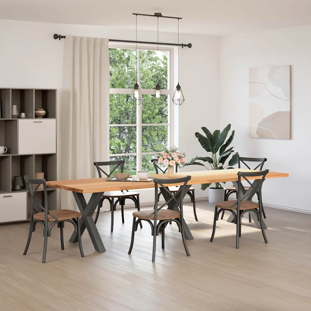 Mach jede Mahlzeit unvergesslich, indem du dich jeden Tag mit deiner Familie oder deinen Freunden um diesen Esstisch aus Holz versammelst! Robustes und langlebiges Material: Massives Eichenholz ist für seine Festigkeit, Haltbarkeit und schöne Maserung bekannt, weshalb es sich hervorragend für haltbare Möbel eignet. Durch seine natürliche Beständigkeit gegen Insektenbefall und Schimmelbildung sehen Eichenmöbel selbst nach jahrelangem Gebrauch brandneu aus.Großer Tisch: Dieser Küchentisch bietet mit seinen Maßen von 320 x 100 cm viel Platz zum Sitzen und ist das Herzstück deines Essbereichs.Einzigartiger Charme: Da Äste, Risse und Farbabweichungen natürliche Merkmale des Eichenholzes sind, hat jedes Stück dieses Produkts seinen ganz eigenen Charme. Auf den Bildern siehst du Beispiele für die zu erwartenden Variationen.Praktisches Design: Diese Esstischbeine sind mit verstellbaren Nivellierfüßen ausgestattet, die auch auf unebenen Böden für Stabilität sorgen und Bodenkratzer minimieren. Außerdem verfügt die Halterung über vorgebohrte Löcher und mitgelieferte Schrauben, mit denen das Bein an der Tischplatte befestigt werden kann, was die Montage erleichtert. Gut zu wissen:Jedes Stück ist ein Unikat, das in Farbe und Maserung variiert. Die Lieferung erfolgt in zufälliger Reihenfolge, wodurch die Exklusivität und Individualität deines Produkts gewährleistet wird.Äste und kleinere Fehler werden mit schwarzem Füllmaterial aufgefüllt, um eine schöne und glatte Tischoberfläche zu erhalten. Beispiele findest du in den Abbildungen.Die Tischplatte ist an den Rändern 4 cm dick, um ein robustes Aussehen zu gewährleisten, und in der Mitte 2 cm dick, um den Holzverbrauch und das Gesamtgewicht zu reduzieren.Bitte bohre die Löcher in der Mitte, nicht an den Rändern der Platte.Bitte achte darauf, die maximale Bohrtiefe von 15 mm nicht zu überschreiten, um die Tischplatte nicht zu beschädigen, da die Plattenstärke 20 mm beträgt.Wir empfehlen, einen Schraubendreher anstelle einer elektrischen Bohrmaschine zu verwenden, um Holzrisse beim Anbringen der Beine zu vermeiden.