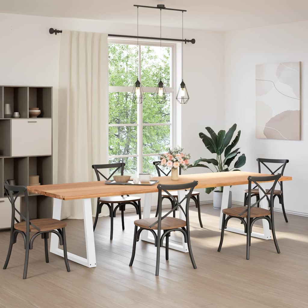 Mach jede Mahlzeit unvergesslich, indem du dich jeden Tag mit deiner Familie oder deinen Freunden um diesen Esstisch aus Holz versammelst! Robustes und langlebiges Material: Massives Eichenholz ist für seine Festigkeit, Haltbarkeit und schöne Maserung bekannt, weshalb es sich hervorragend für haltbare Möbel eignet. Durch seine natürliche Beständigkeit gegen Insektenbefall und Schimmelbildung sehen Eichenmöbel selbst nach jahrelangem Gebrauch brandneu aus.Großer Tisch: Dieser Küchentisch bietet mit seinen Maßen von 320 x 100 cm viel Platz zum Sitzen und ist das Herzstück deines Essbereichs.Einzigartiger Charme: Da Äste, Risse und Farbabweichungen natürliche Merkmale des Eichenholzes sind, hat jedes Stück dieses Produkts seinen ganz eigenen Charme. Auf den Bildern siehst du Beispiele für die zu erwartenden Variationen.Praktisches Design: Diese Esstischbeine sind mit verstellbaren Nivellierfüßen ausgestattet, die auch auf unebenen Böden für Stabilität sorgen und Bodenkratzer minimieren. Außerdem verfügt die Halterung über vorgebohrte Löcher und mitgelieferte Schrauben, mit denen das Bein an der Tischplatte befestigt werden kann, was die Montage erleichtert. Gut zu wissen:Jedes Stück ist ein Unikat, das in Farbe und Maserung variiert. Die Lieferung erfolgt in zufälliger Reihenfolge, wodurch die Exklusivität und Individualität deines Produkts gewährleistet wird.Äste und kleinere Fehler werden mit schwarzem Füllmaterial aufgefüllt, um eine schöne und glatte Tischoberfläche zu erhalten. Beispiele findest du in den Abbildungen.Die Tischplatte ist an den Rändern 4 cm dick, um ein robustes Aussehen zu gewährleisten, und in der Mitte 2 cm dick, um den Holzverbrauch und das Gesamtgewicht zu reduzieren.Bitte bohre die Löcher in der Mitte, nicht an den Rändern der Platte.Bitte achte darauf, die maximale Bohrtiefe von 15 mm nicht zu überschreiten, um die Tischplatte nicht zu beschädigen, da die Plattenstärke 20 mm beträgt.Wir empfehlen, einen Schraubendreher anstelle einer elektrischen Bohrmaschine zu verwenden, um Holzrisse beim Anbringen der Beine zu vermeiden.
