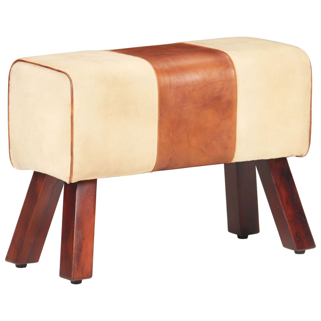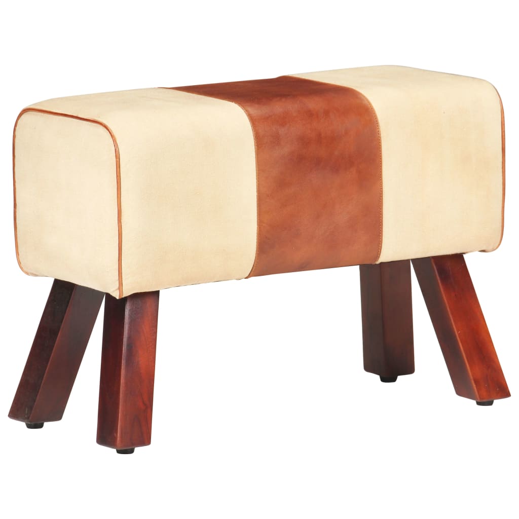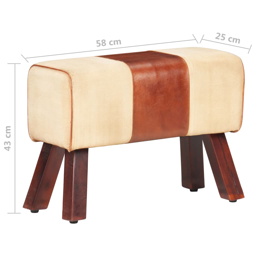 Schaffe eine Vintage-Atmosphäre in deinem Wohnraum mit dieser Bock-Sitzbank aus Echtleder. Diese Bank ist mit strapazierfähigem Echtleder und Canvas bezogen und bietet ein hervorragendes Sitzgefühl. Die Sitzbank im Turnbock-Design ist mit Beinen aus massivem Mangoholz versehen, die für Stabilität und Robustheit sorgen. Zudem bietet die dicke Polsterung zusätzlichen Komfort.