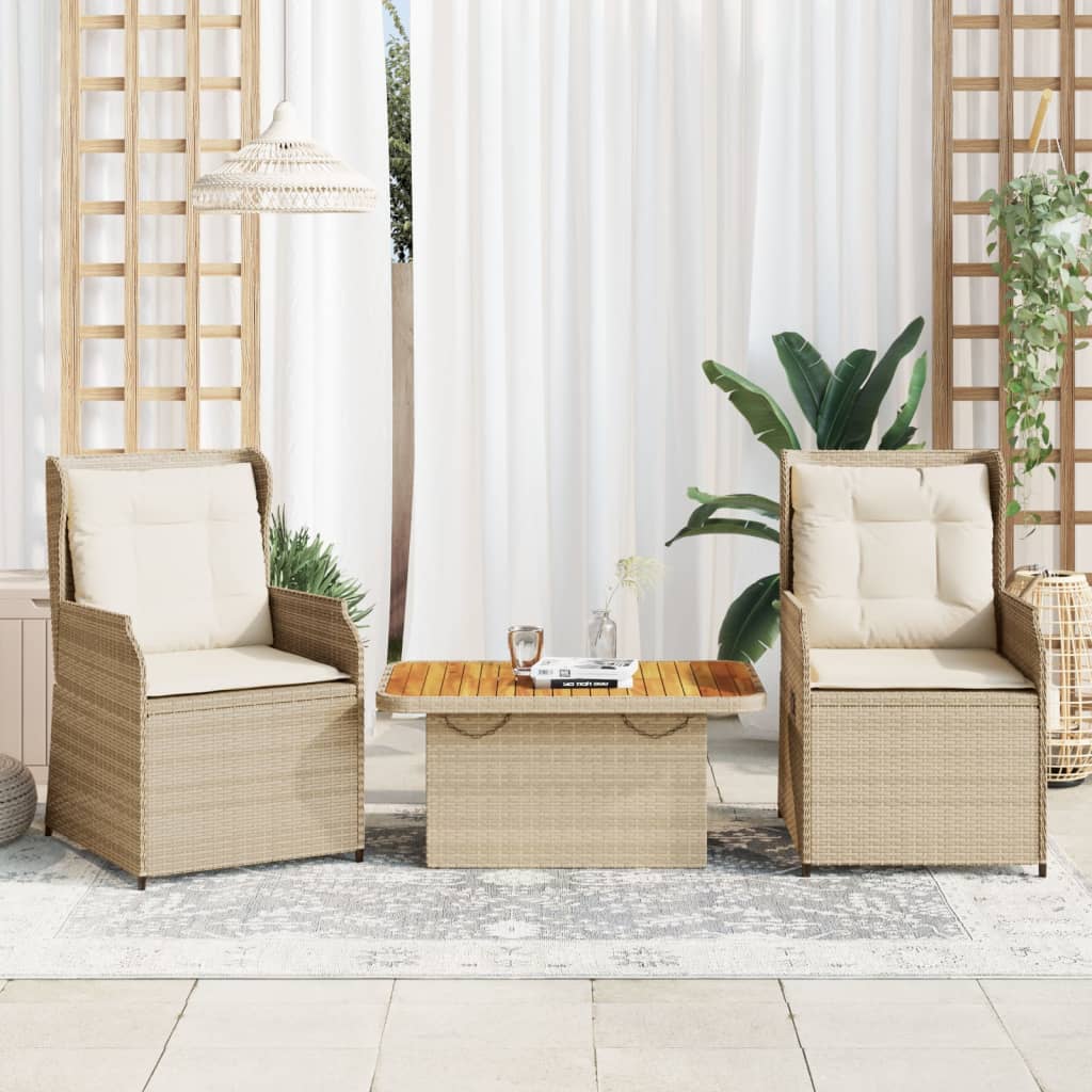 Dieses Garten-Lounge-Set ist die perfekte Ergänzung zu deinem Garten, deiner Terrasse oder deinem Innenhof. Es bietet einen bequemen und einladenden Platz, um mit Familie und Freunden zu plaudern oder dich einfach nur zu entspannen und das Leben im Freien zu genießen. Langlebiges Material: PE-Rattan, auch als Poly Rattan bekannt, ist ein robustes, pflegeleichtes synthetisches Material, das die Optik von natürlichem Rattan aufweist. Es kennzeichnet sich durch ein geringes Eigengewicht und lässt sich einfach reinigen. Aufgrund seiner Haltbarkeit und Witterungsbeständigkeit wird es häufig bei der Herstellung von Gartenmöbeln verwendet.Verstellbare Rückenlehne: Der Gartensessel ist mit einem Griff an der rechten Seite versehen. So kannst du die Rückenlehne durch Ziehen des Griffs in jede beliebige Position bringen. Die Rückenlehne lässt sich über den Griff auch schnell wieder in die ursprüngliche Position bringen.Abnehmbarer und waschbarer Bezug: Diese Sitzkissen verfügen über abnehmbare Bezüge für einfaches Waschen und Pflegen.Bequemes Sitzerlebnis: Dieser Gartensessel mit dick gepolsterten Kissen bietet ein angenehmes Sitzgefühl.Stabile und pflegeleichte Tischplatte: Dieser Gartentisch besitzt eine Tischplatte aus Akazienholz, die robust und langlebig ist und sich leicht mit einem feuchten Tuch reinigen lässt.Robustes und stabiles Gestell: Der pulverbeschichtete Stahlgestell ist stark, stabil, langlebig sowie korrosions- und wetterbeständig, um eine lang anhaltende Leistung zu gewährleisten. Gut zu wissen:Wir empfehlen dir, deine Gartenmöbel mit einer wasserdichten Hülle zu schützen, um lange Zeit eine ansprechende Optik aufzuweisen.