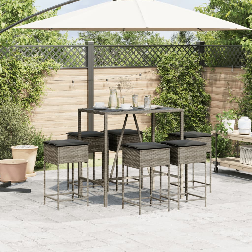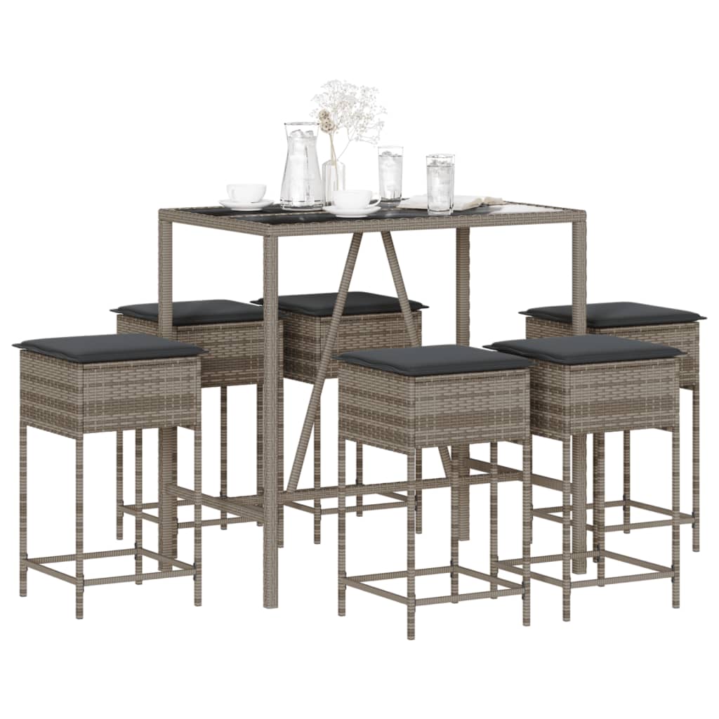 7-tlg. Gartenbar-Set mit Kissen Grau Poly Rattan