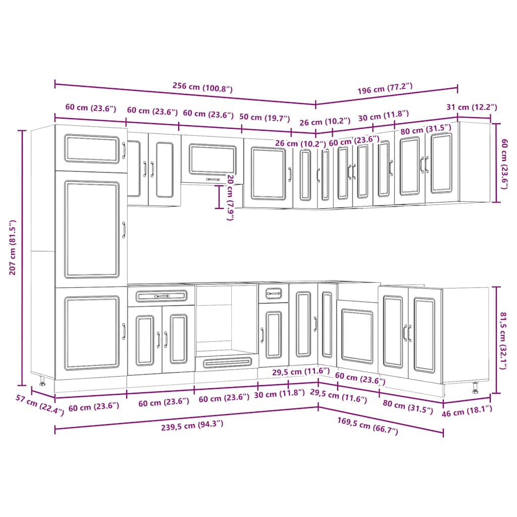 Mit ihrem eleganten Design optimiert diese 14-teilige Küchenzeile Ihre Küche und bietet reichlich Platz für Ihre Küchenausstattung! Starkes und langlebiges Material: Holzwerkstoff ist ein langlebiges und robustes Material mit einer glatten Oberfläche, das gegen Feuchtigkeit, Verformung und Rissbildung beständig ist, wodurch es eine zuverlässigen Wahl für die Herstellung von Möbeln ist.Viel Stauraum: Das Küchenschrank-Set hat viele Fächer und bietet ausreichend Platz für Schüsseln, Teller, Töpfe und andere Küchengeräte.Verstellbare Füße: Die Unterschränke sind mit verstellbaren Füßen ausgestattet, die sich in der Höhe an deine Kücheneinrichtung anpassen lassen.Pflegeleicht: Dank der glatten Oberfläche lassen sich diese Küchenschränke leicht mit einem feuchten Tuch reinigen und benötigen weniger Pflege. Achtung:Um ein Umkippen zu vermeiden, sollte dieses Produkt mit der mitgelieferten Wandhalterung gesichert werden. Gut zu wissen:Schrauben und Dübel für die Wandbefestigung sind nicht enthalten. Suchen und verwenden Sie die für Ihre Wände geeigneten Schrauben und Dübel. Wenn Sie unsicher sind, suchen Sie professionelle Hilfe. Lesen und befolgen Sie jeden Schritt der Anleitung sorgfältig.Die Arbeitsplatte, das Spülbecken und der Wasserhahn sind nicht im Lieferumfang enthalten.