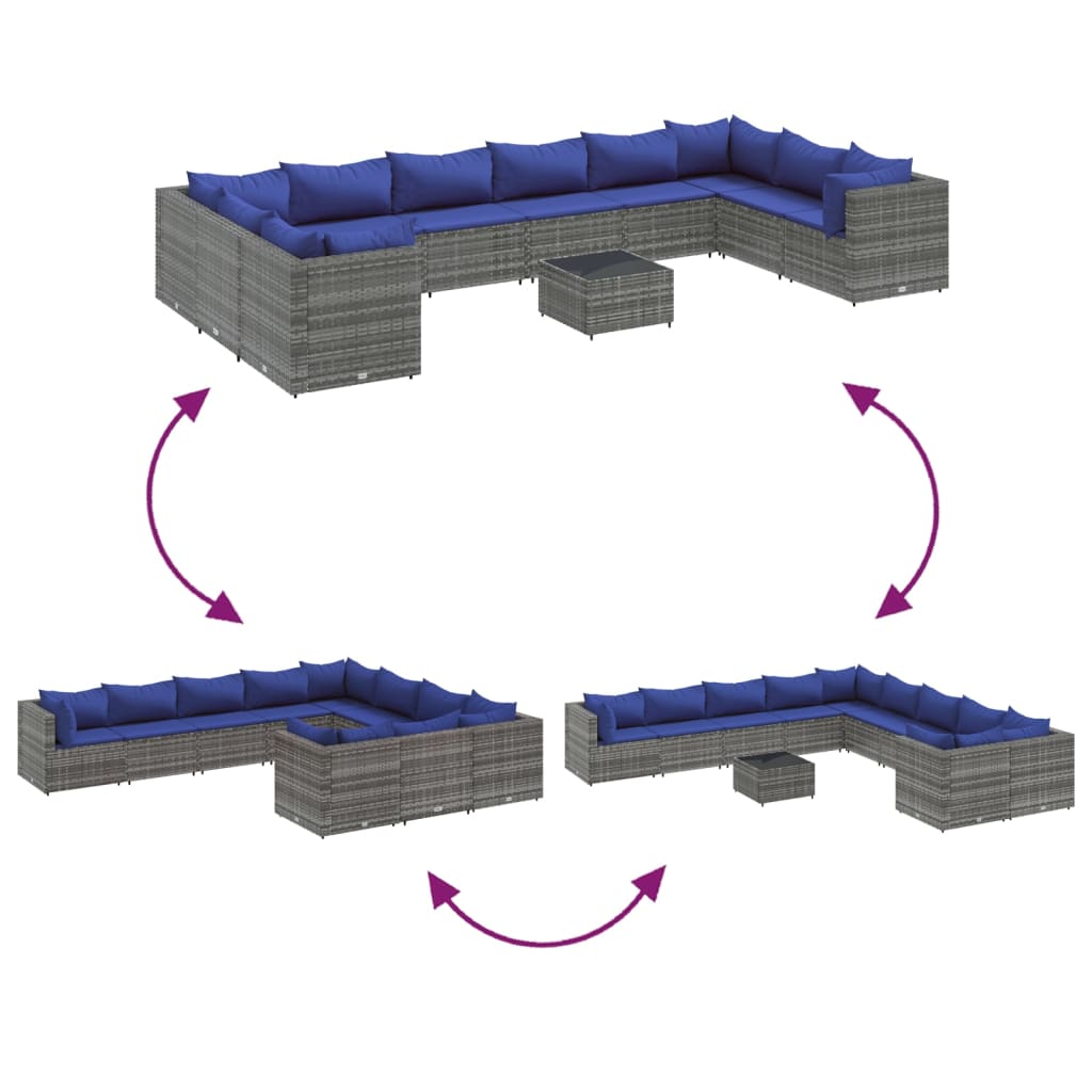 11-tlg. Garten-Sofagarnitur mit Kissen Grau Poly Rattan
