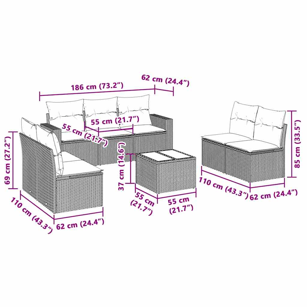 8-tlg. Garten-Sofagarnitur mit Kissen Hellgrau Poly Rattan