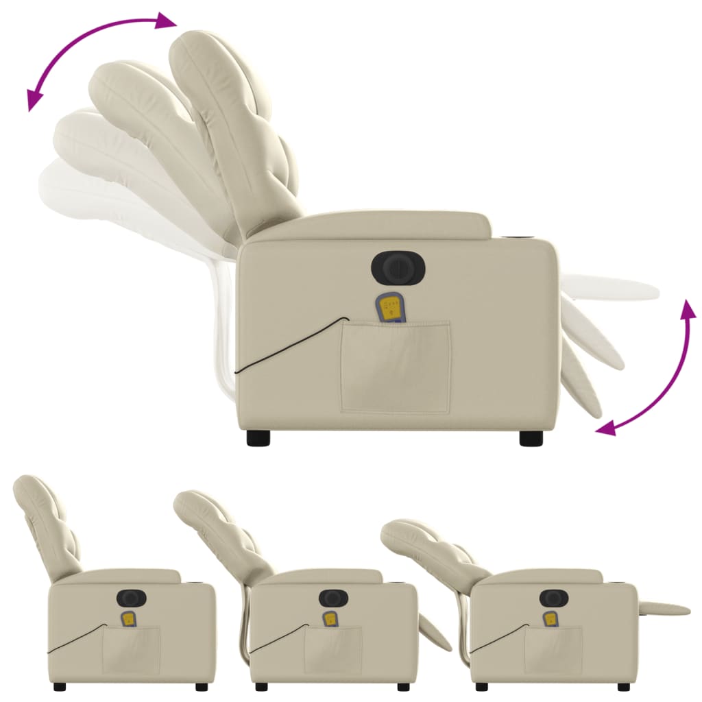 Lehne dich zurück und entspanne dich in diesem äußerst bequemen Massagesessel! Elektrische Liegefunktion: Dieser Relaxsessel ist mit einem Elektromotor ausgestattet, der Fußstütze und Rückenlehne durch einfaches Drücken des seitlichen Knopfes automatisch in jede gewünschte Position bringt. Diese Funktion ermöglicht eine maximale Neigung von 135 Grad. Darüber hinaus lässt sich die Rückenlehne auf Knopfdruck automatisch in die ursprünglichen Position zurückbringen.Vibrationsfunktion: Dank der 6 Massagepunkte genießt du eine gezielte Massage. Zudem lassen sich verschiedene Massageprogramme über die mitgelieferte Handsteuerung auswählen. Die Massagefunktion wird über den USB-Anschluss betrieben, der eine zertifizierte 5-V-USB-Stromquelle erfordert (nicht im Lieferumfang enthalten).Bequemes Sitzerlebnis: Die dick gepolsterte Sitzfläche, die Rückenlehne und die breiten, mit Kunstleder bezogenen Armlehnen sorgen für ein behagliches und angenehmes Sitzgefühl. Kunstleder ist ein äußerst langlebiges Material. Es ist schmutzabweisend und lässt sich mit einem feuchten Tuch einfach reinigen. Durch die glatte Oberfläche weist es die luxuriöse Schönheit von Echtleder auf.Praktische Getränkehalter und Seitentasche: Dieser Sessel verfügt über zwei praktische Becherhalter und eine Seitentasche, in der du wichtige Sachen griffbereit aufbewahren kannst.Solider und stabiler Rahmen: Der Rahmen aus Holz und Metall sorgt für eine solide Struktur und hohe Stabilität. Dieser TV-Sessel ist bequem und langlebig.