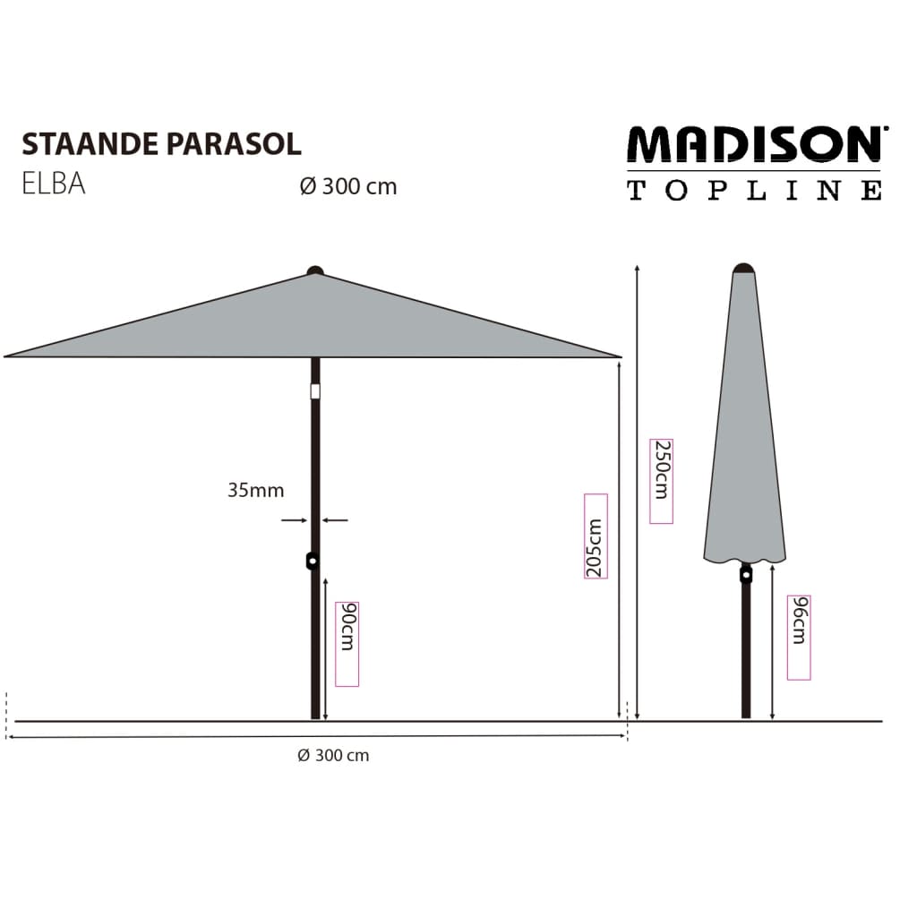 Mit diesem Elba Sonnenschirm von Madison schaffst du einen gemütlichen Schattenplatz in deinem Garten oder auf deiner Terrasse! Praktischer Push-up-Mechanismus: Dieser Gartenschirm ist mit einem benutzerfreundlichen Push-up-System ausgestattet und lässt sich daher mühelos zusammen- und aufklappen. So ist der Sonnenschirm im Handumdrehen einsatzbereit!Kipp- und Vorspannmechanismus: Dank des praktischen Kippmechanismus kann die Bespannung des Sonnenschirms gegen die Sonne geneigt werden. Zudem ist Elba mit einem einzigartigen Vorspannsystem ausgestattet, sodass die Bespannung immer schön straff ist.Höhenverstellbar: Du kannst die Höhe des Sonnenschirms durch Drehen des Griffs einstellen.Rostfreier Mast und strapazierfähiger Stoff: Der Mast des Sonnenschirms ist komplett aus rostfreiem Aluminium gefertigt. Die große runde Bespannung besteht aus 100 % Polyester mit PA-Beschichtung, was Elba wasser- und schmutzabweisend macht. Zudem hat die Bespannung einen UPF-Wert von 50+ und ist also auch UV-beständig.Windfang: Dieser Sonnenschirm ist mit einem Windfang ausgestattet, der das Wegwehen und Umkippen bei Wind verhindert. Verwende immer einen Schirmständer mit einem Mindestgewicht von 40 kg. (Der Ständer ist nicht im Lieferumfang enthalten)