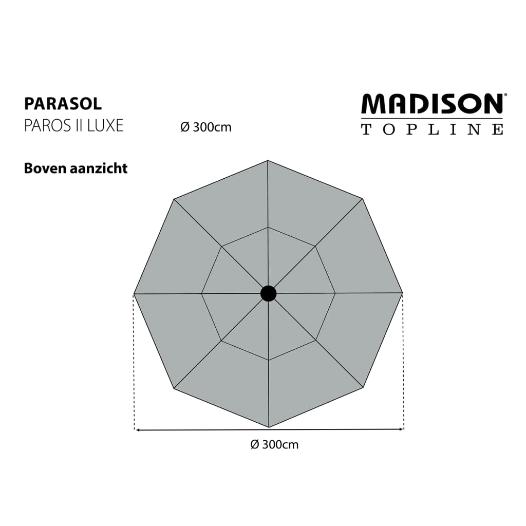 Mit dem Sonnenschirm Paros II Luxe aus der Madison TOPLINE Kollektion erwerben Sie mit Sicherheit einen langlebigen, stabilen Sonnenschutz von herausragender Qualität, perfekt für Ihren Outdoor-Wohnbereich! Die zwei wichtigsten Merkmale dieses Sonnenschirms sind sein praktischer Kippmechanismus und der bedienfreundliche Kurbelmechanismus zum Öffnen und Schließen des Schirms. Darüber hinaus verfügt der Gartenschirm über eine wasserabweisende Schirmbespannung (von 220 g/m²) mit Volant aus hochwertigem Polyestergewebe mit PA-Beschichtung, die dank des Schutzfaktors UPF 50+ bis zu 2000 Stunden lang einen hervorragenden Schutz gegen UV-Strahlen bietet! Bitte beachten Sie, dass dieser Sonnenschirm einen Sonnenschirmfuß von mindestens 55 kg benötigt (nicht im Lieferumfang enthalten). Der Gartenschirm wird am besten mit den Madison Sonnenschirmhüllen geschützt, die separat im Sortiment zu kaufen sind.
