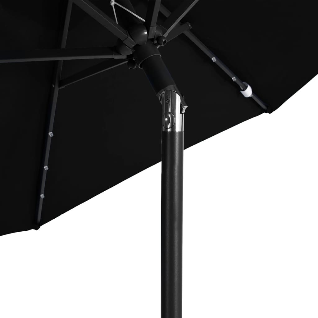Dieser Sonnenschirm eignet sich perfekt, um Schatten zu spenden und dich vor den schädlichen UV-Strahlen der Sonne zu schützen. Schutz vor Sonne und Regen: Dieser Sonnenschirm aus strapazierfähigem Polyester bietet Schutz vor Sonne und Regen und ist ein idealer Ort, um den Outdoor-Bereich zu genießen. Robuste Konstruktion: Dieser Gartenschirm wird von einer robusten Stange und Rippen getragen, sodass er auch an windigen Tagen an Ort und Stelle bleibt. Kurbel- und Kipp-Mechanismus: Dieser Outdoor-Sonnenschirm mit Kurbel lässt sich leicht öffnen und schließen. Mit dem Kippmechanismus per Knopfdruck kannst du den Balkonschirm kippen, um die Sonne abzuschirmen und es kühl und bequem zu haben.Helle LED-Leuchten: Die integrierte LED-Beleuchtung des Schirms erhellt deinen Außenbereich und schafft ein gemütliches und romantisches Ambiente bei Sonnenuntergang. Gut zu wissen:Dieses Produkt ist kein Spielzeug! Achte darauf, dass Kinder weder den Balkonschirm noch den Bezug oder den Schirmständer zum Spielen oder Klettern benutzen. Offenes Feuer (z. B. Gartengrill oder Grill) unter oder direkt neben diesem Produkt vermeiden. Dieses Produkt ist nicht zu 100 % wasserdicht. Wir empfehlen daher, es mit einem Imprägnierspray zu behandeln, um eine bessere Wasserfestigkeit zu gewährleisten.