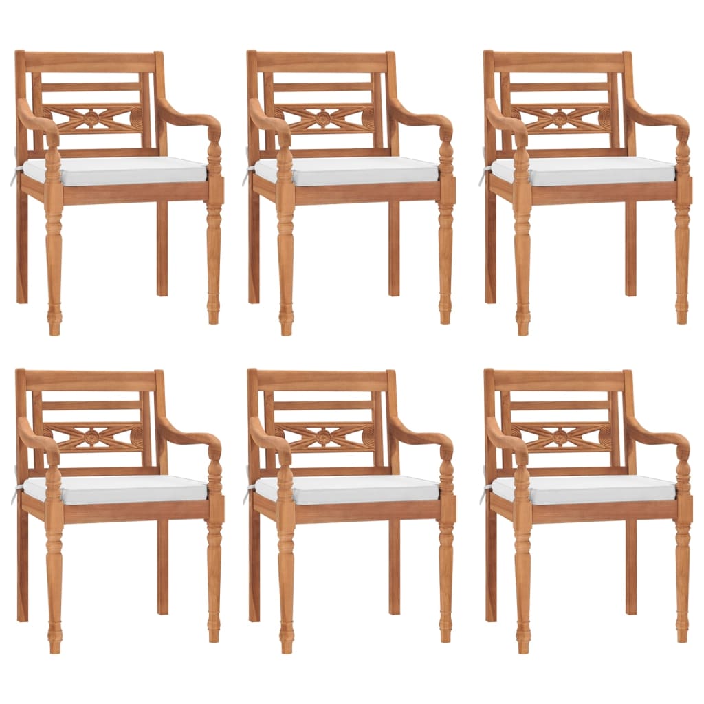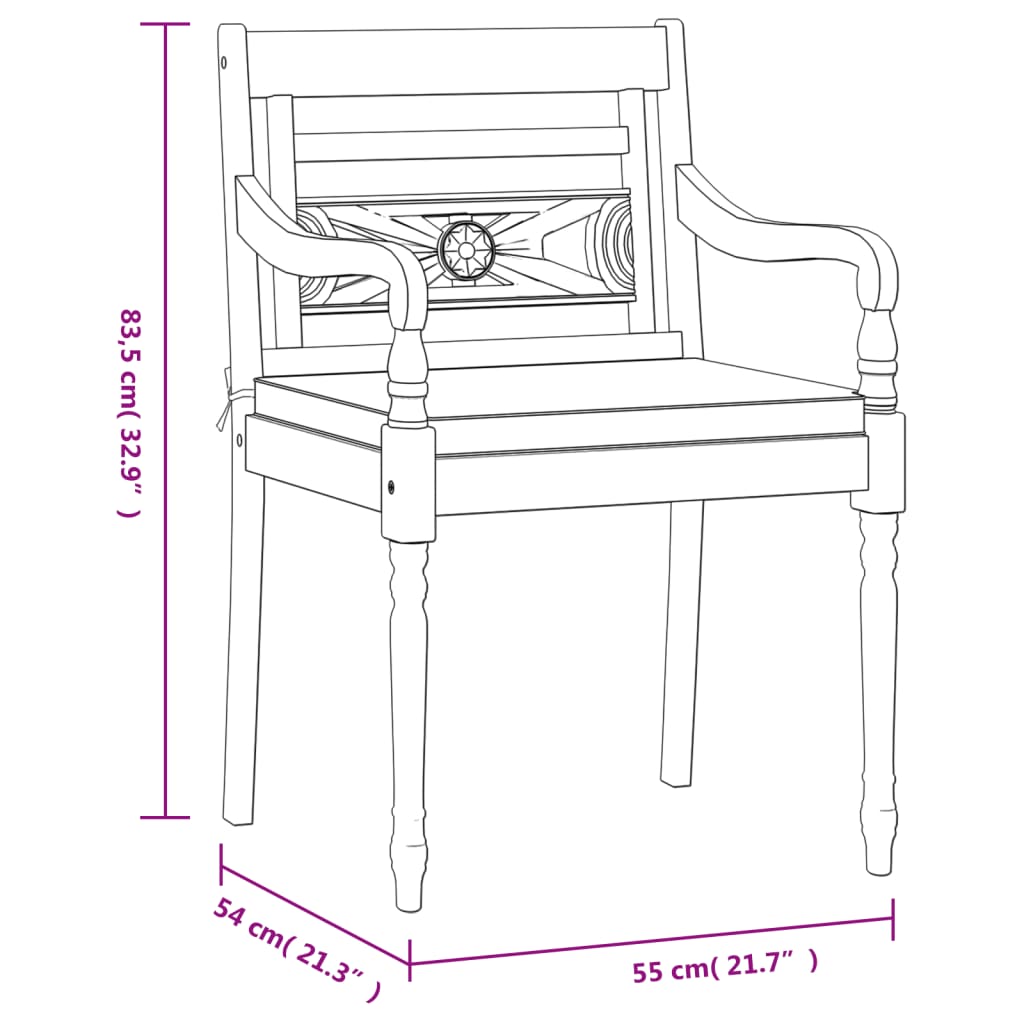 Mit dieser Batavia-Essgruppe aus Holz kannst du eine angenehme Mahlzeit oder den Nachmittagstee in deinem Außenbereich genießen! Mit ihren zarten, geschwungenen Armlehnen und dekorativen Schnitzereien ist dieses Gartengarnitur ein echter Hingucker im Garten oder auf der Terrasse! Robustes Material: Massives Teakholz ist ein wunderschönes Naturmaterial. Es wurde abgelagert, getrocknet und anschließend fein geschliffen, um eine sehr glatte Optik und Haptik zu erhalten. Teakholz ist für seine außergewöhnliche Festigkeit und Witterungsbeständigkeit bekannt.Praktische Tischplatte: Die robuste Tischplatte bietet Platz für Snacks, Obstkörbe, Dekorationsartikel und andere Sachen.Trendiges Design: Diese formschöne Essgruppe verleiht deinem Garten einen Hauch von rustikalem Charme und eignet sich hervorragend zum Entspannen im Freien mit deinen Freunden und deiner Familie.Komfortables Sitzerlebnis: Dank der dick gepolsterten Sitzkissen ist das Möbelset sehr bequem. Gut zu wissen:Damit deine Gartenmöbel lange schön bleiben, empfehlen wir dir, sie mit einer wasserdichten Hülle zu schützen.